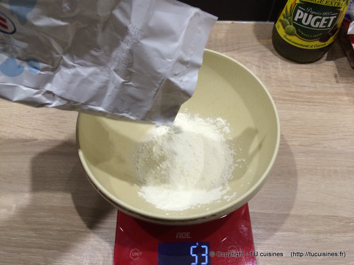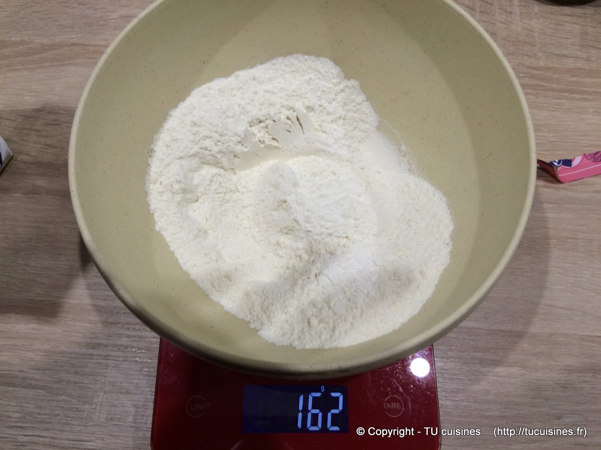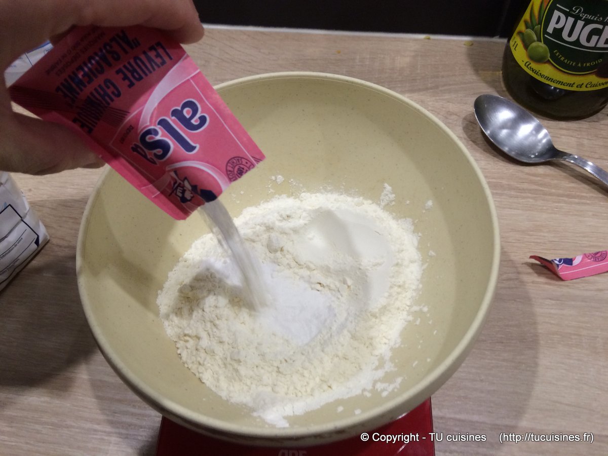 - Dans un saladier, avec 150g de farine avec un paquet de levure chimique.