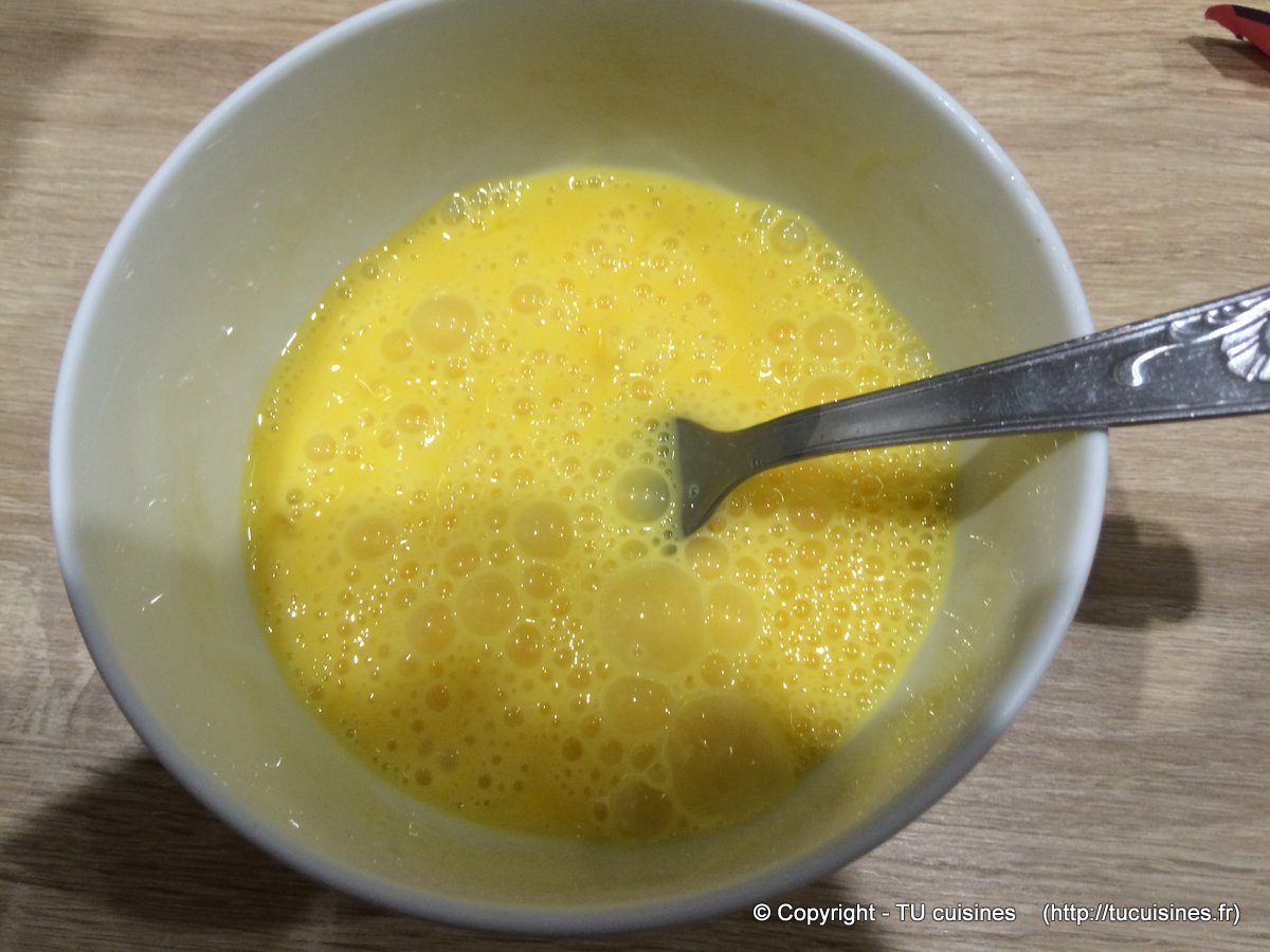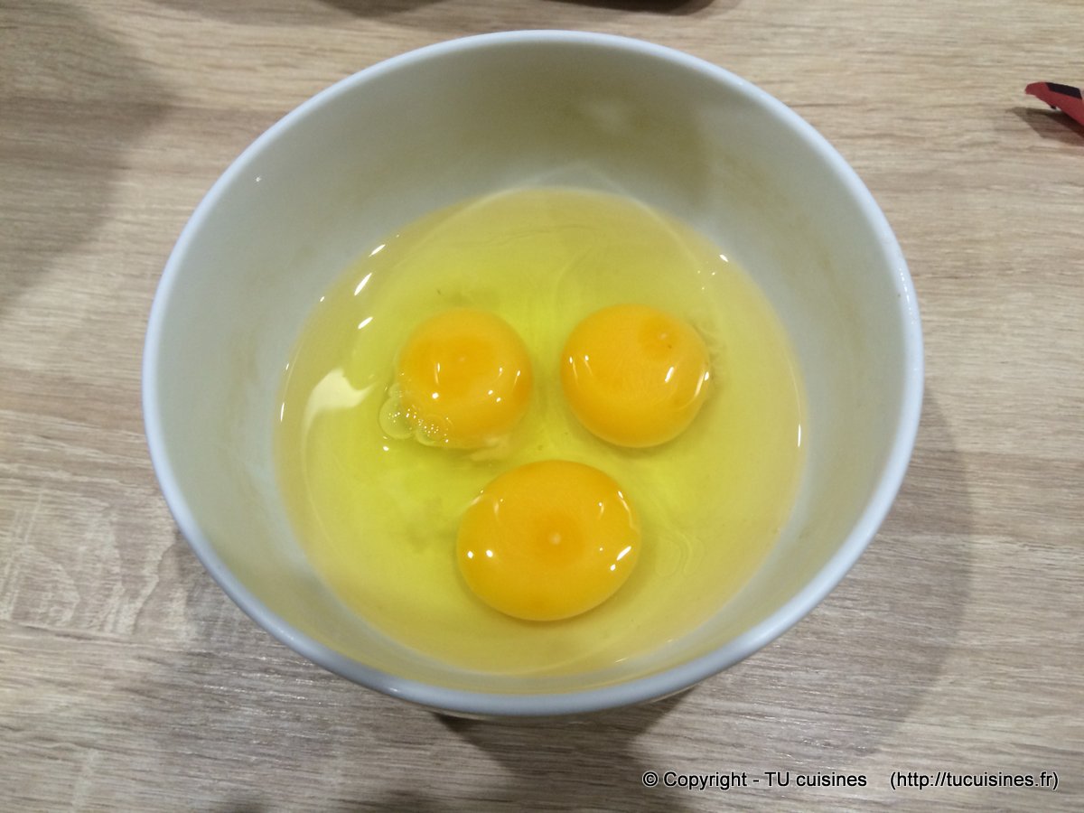 - Dans un grand bol, casse les 3 oeufs et bats-les en omelette.