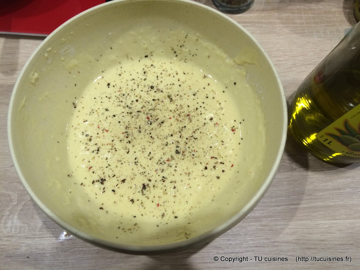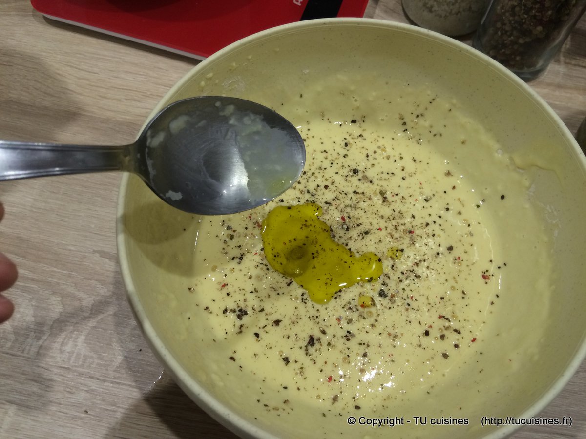- Mets "2" dans "1" avec l'huile et le gruyère râpé