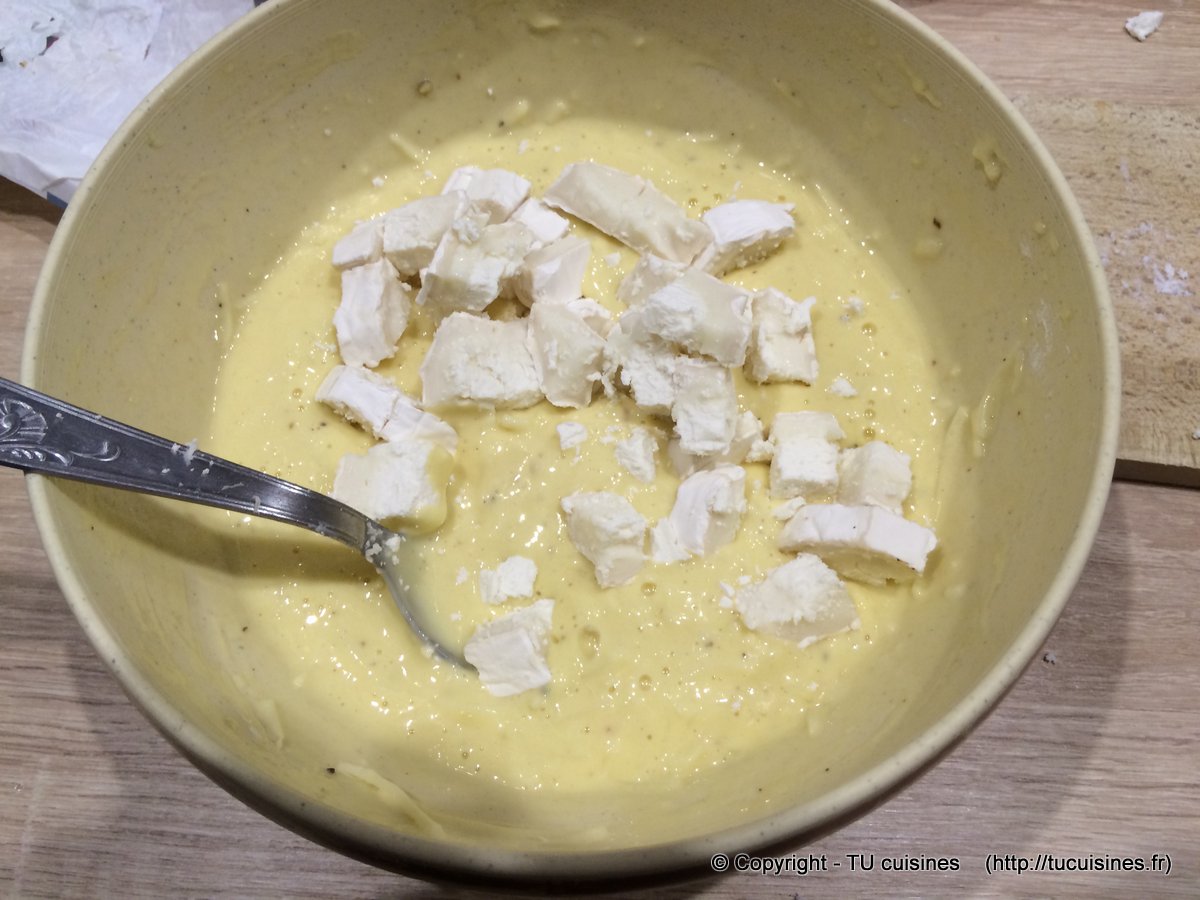 - Coupe 100g de fromage chèvre en rondelles (soit une demi-bûchette environ), recoupe-les en dés (6-8 dés par rondelle) et ajoute-les à la pâte.