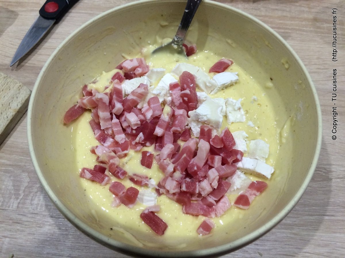 - Ajoute le paquet de 100g de lardons ou de dés de jambon dans la pâte.