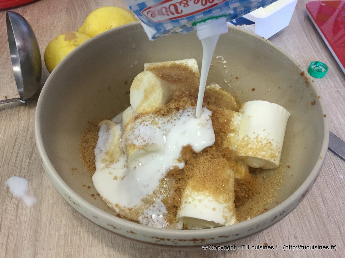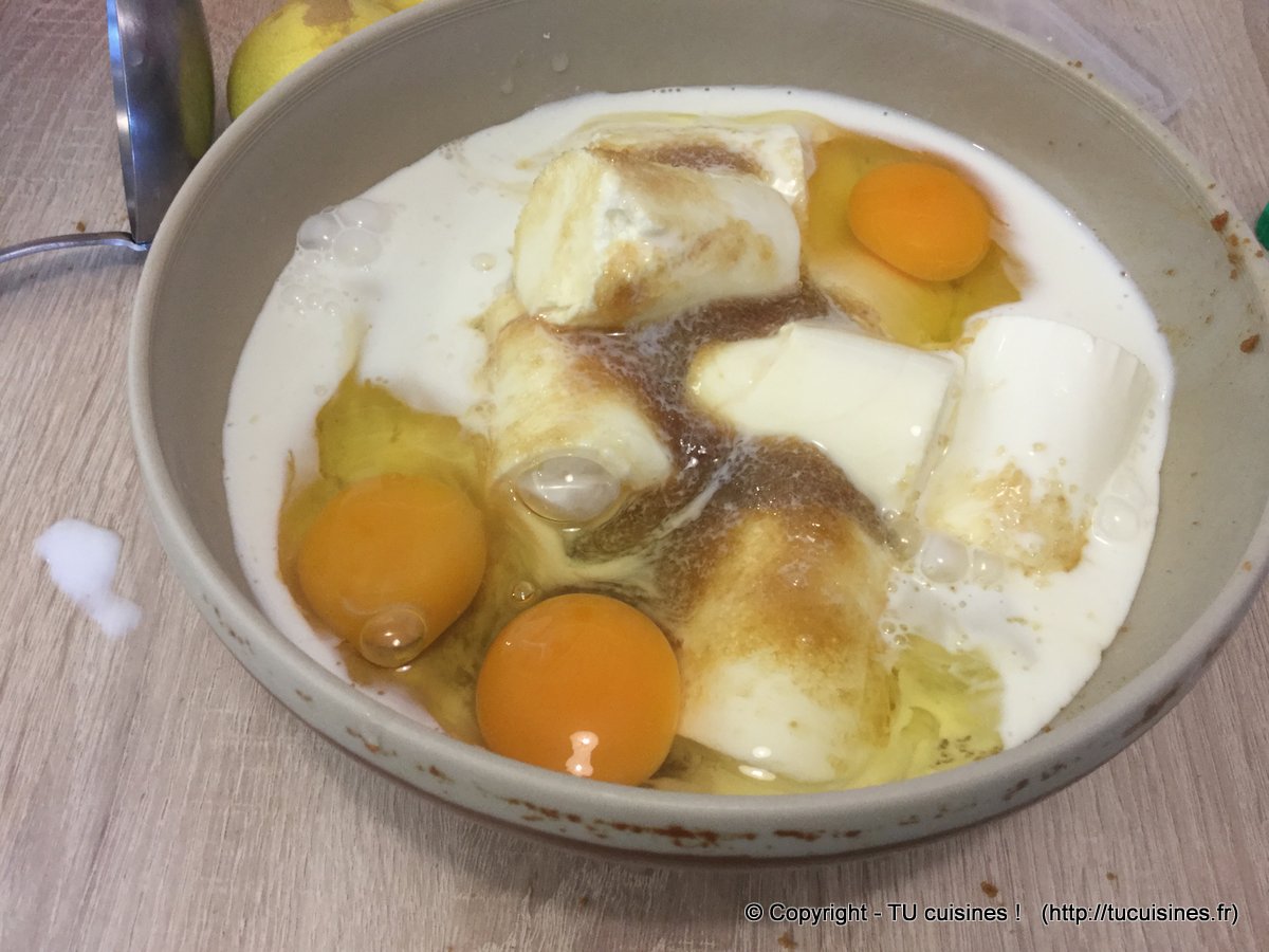 - Ajoute le reste des ingrédients pour la base crémeuse (sucre cassonade, crème fraîche et oeufs), et mélange bien l'ensemble.