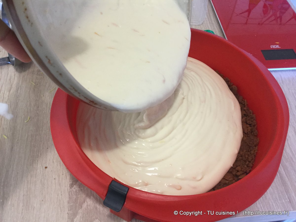 - Verse la base crémeuse sur le biscuit dans le moule…