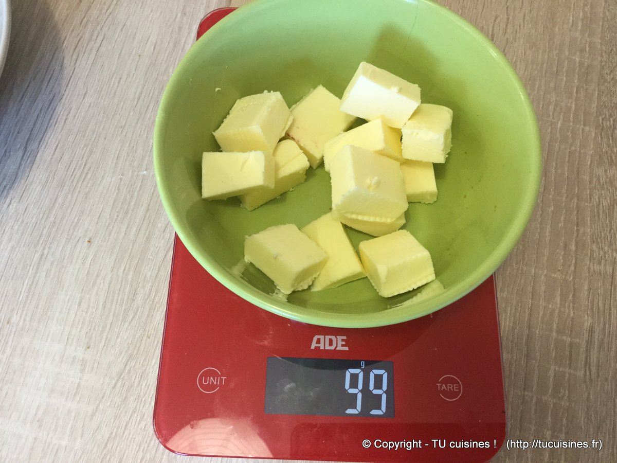 - Coupe 100 g de beurre en dés et fais le fondre au micro-ondes quelques secondes