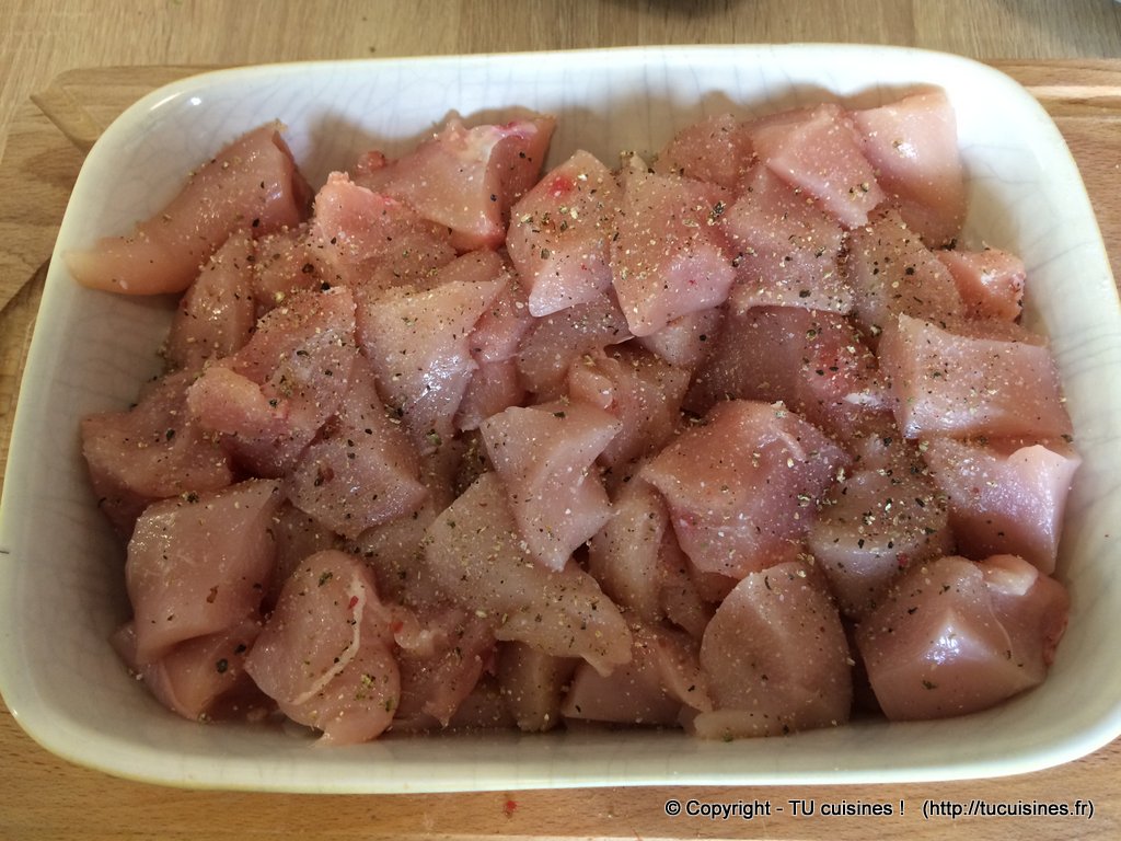 - Coupe les filets de poulet en gros cubes et assaisonne-les