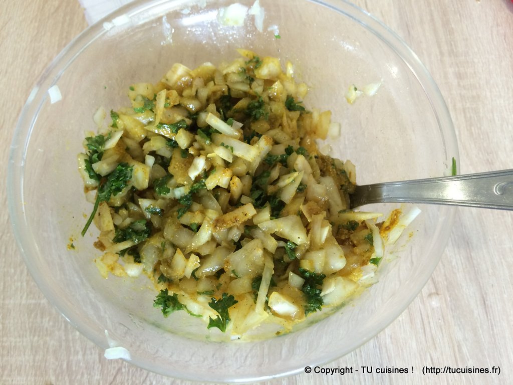 - Émince également 2 oignons, assez grossièrement (moins finement en tout cas que pour la marinade).