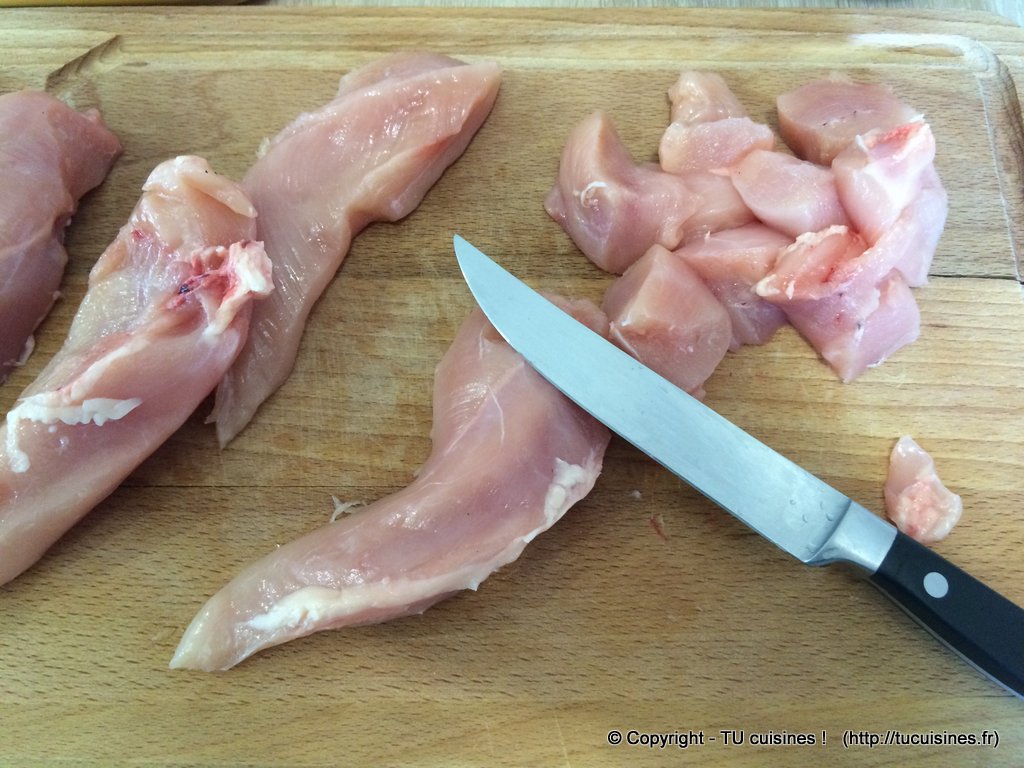 1. Coupe les escalopes de poulet en cubes grossiers d'environ 3 à 4 cm de côté.