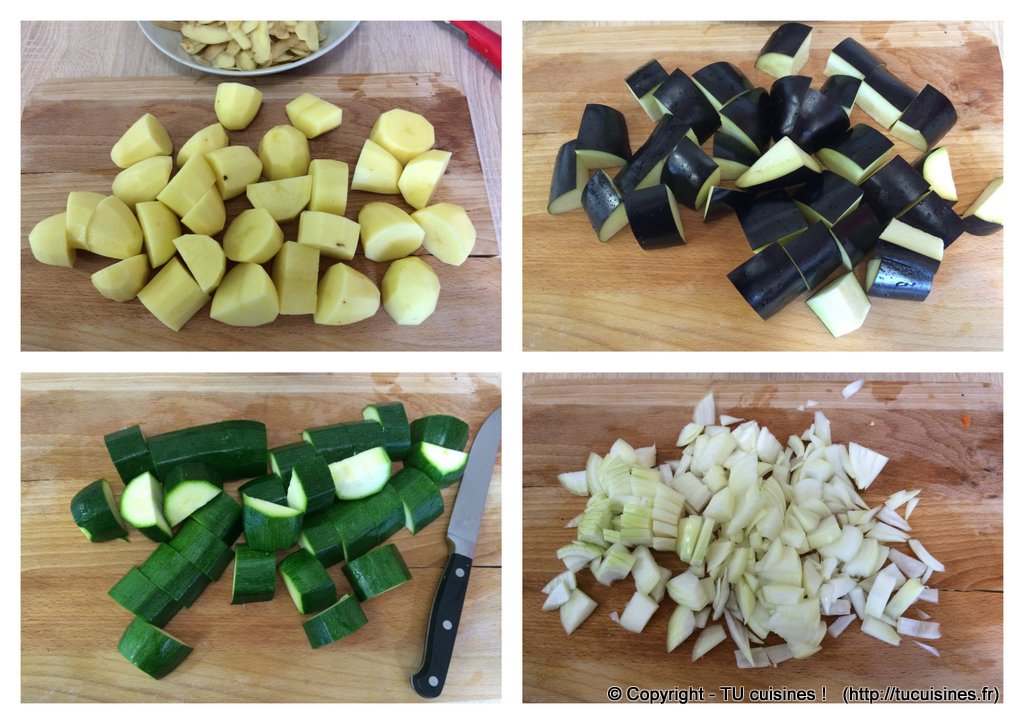1. Pendant ce temps, tu auras coupé tous les légumes (6 à 8 pommes de terre, 2 aubergines et 2 courgettes) en gros cubes d'environ 4 à 5 cm de côté.