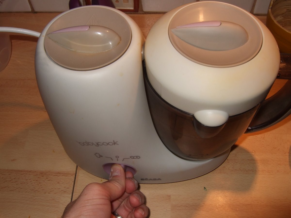 1. Verse les fruits cuits dans un mixeur (c'est parfait aussi dans un "baby cook" si tu as des enfants).