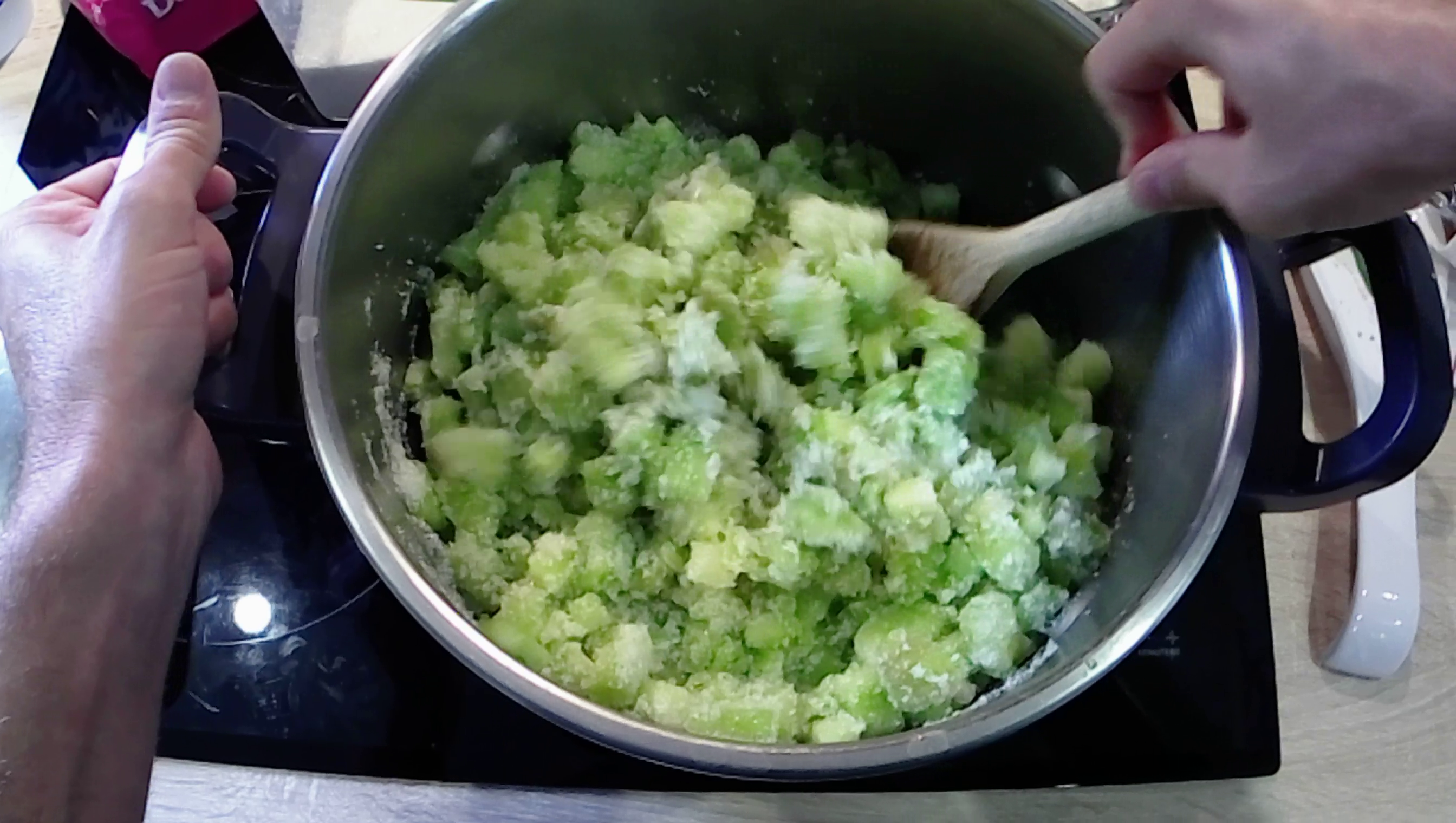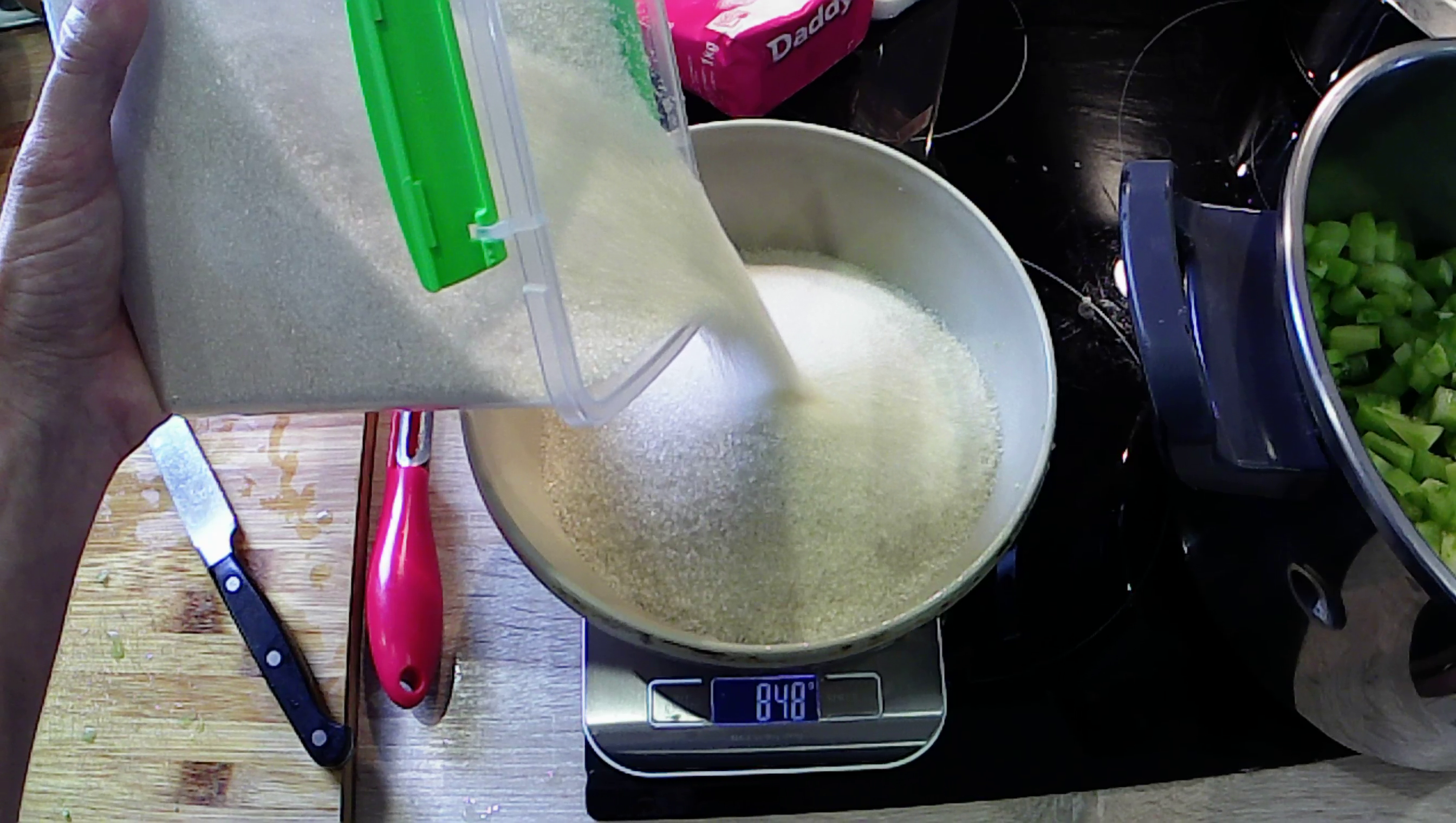 - Pèse le sucre (3/4 de poids de sucre par rapport au poids de la chair des tomates environ) et ajoute-le dans la marmite.
