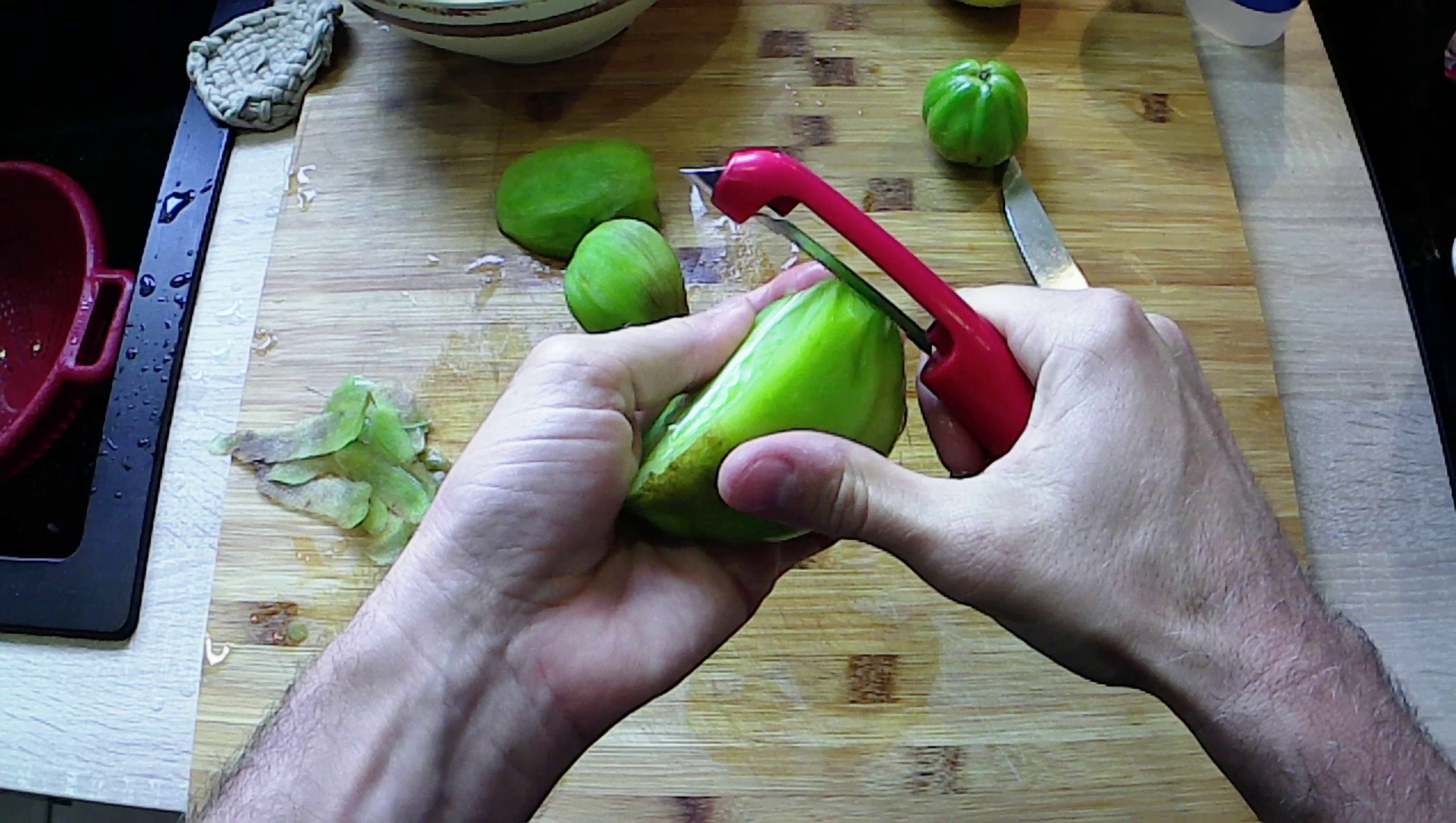 1. Tu peux éplucher la peau des tomates en utilisant un économe (la peau des tomates vertes étant encore assez dure, ça devrait bien fonctionner).