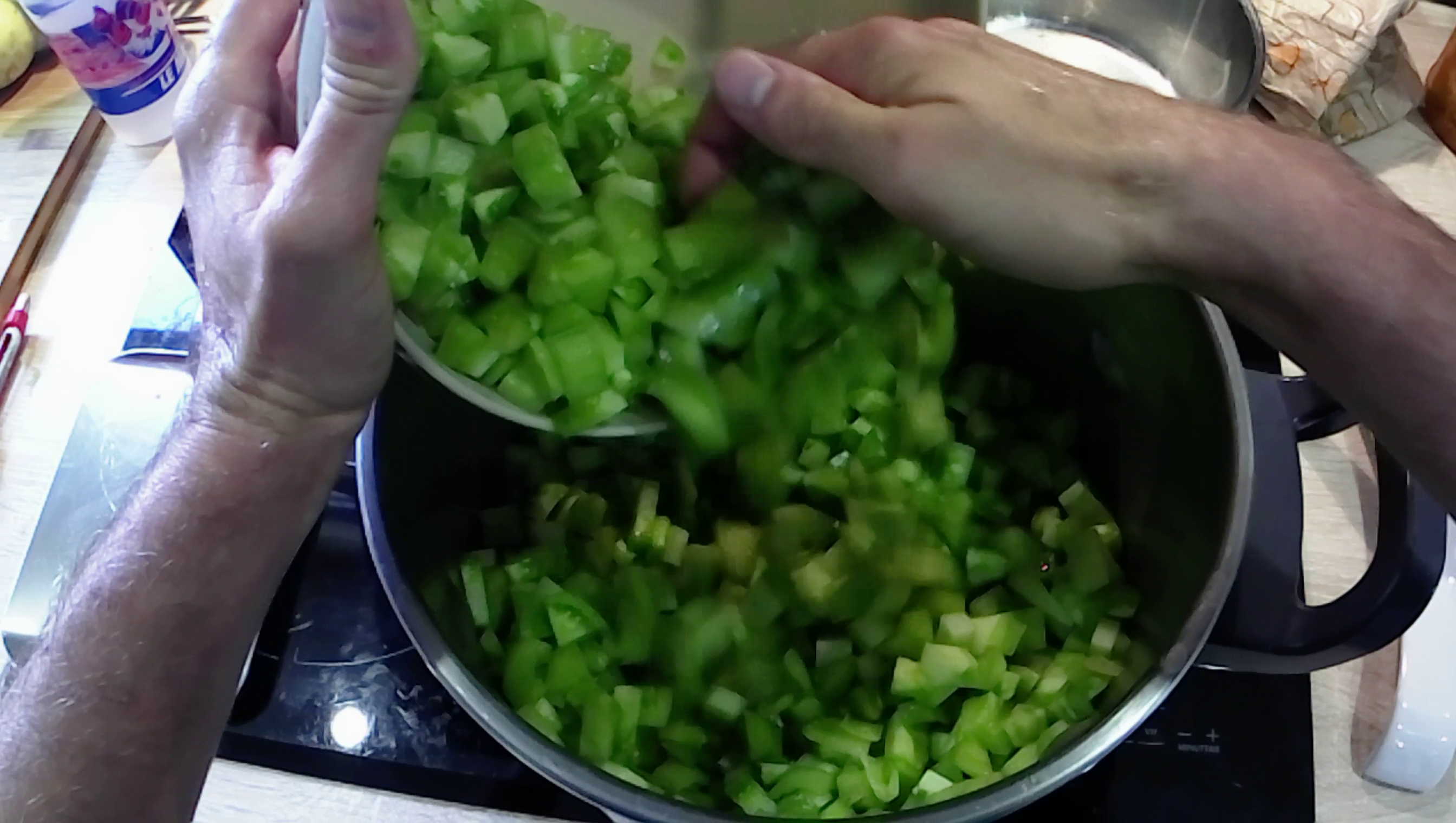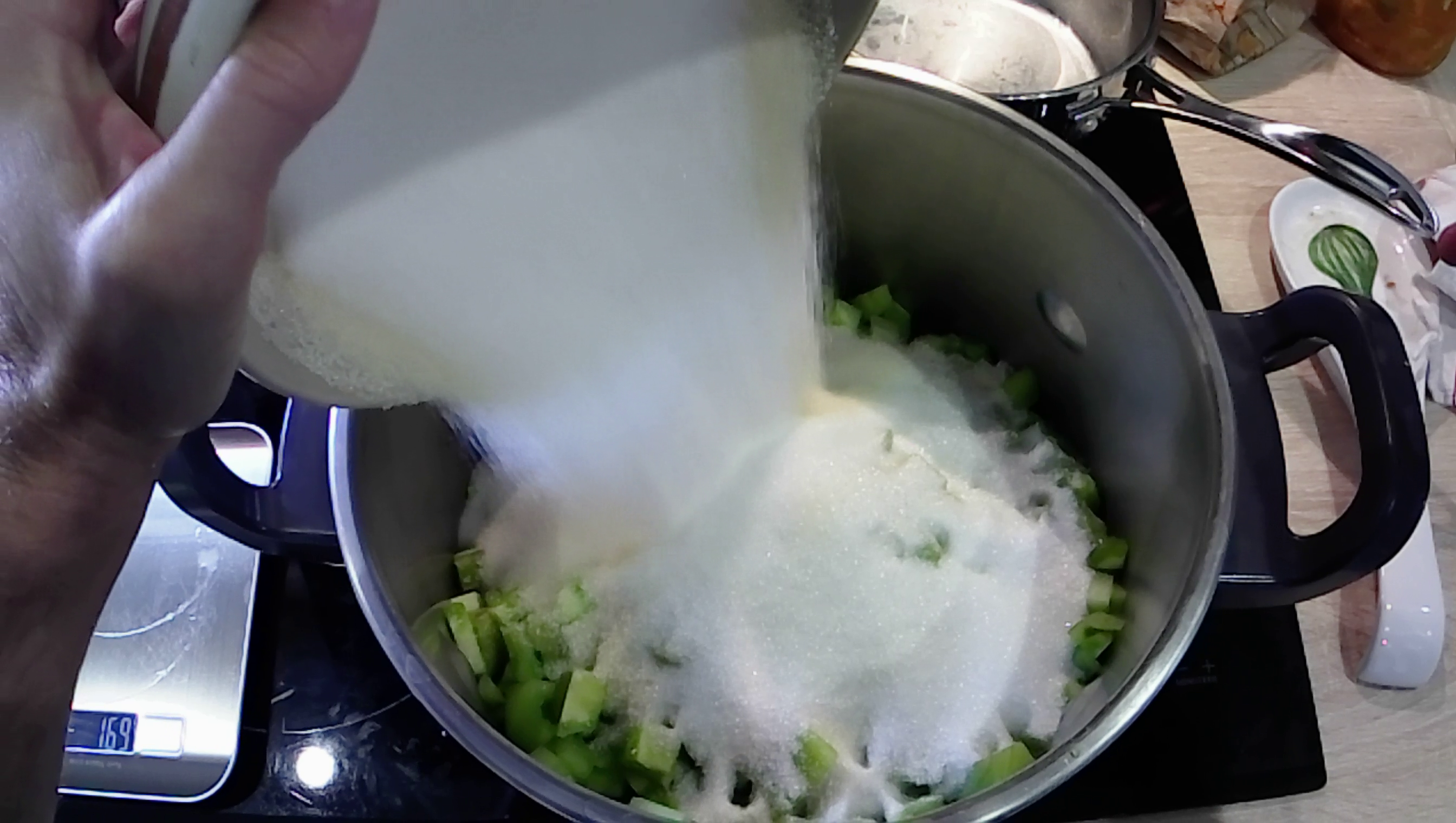 1. Pèse le sucre (3/4 de poids de sucre par rapport au poids de la chair des tomates environ) et ajoute-le dans la marmite.