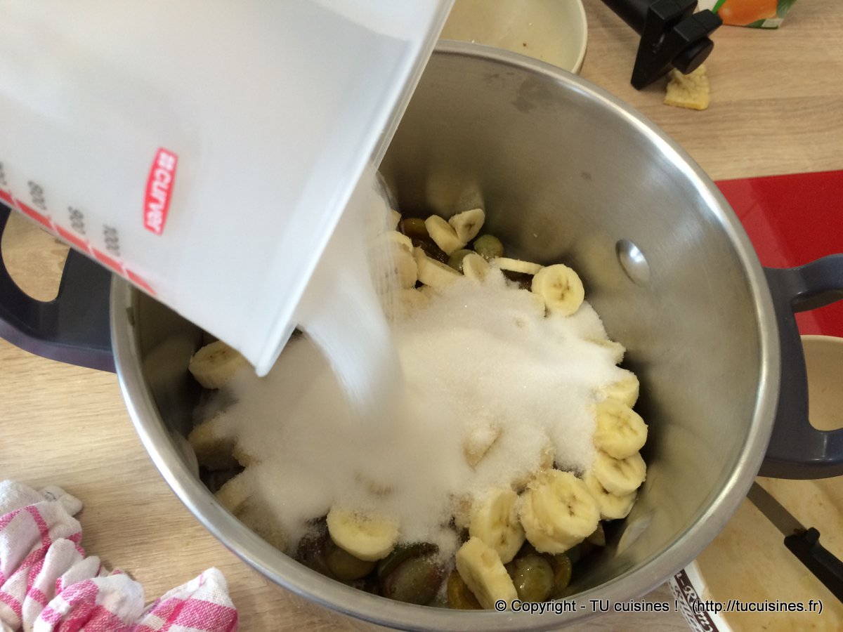 2. Ajoute ainsi du sucre pour un poids d'environ 1/3 de celui des fruits (prunes + bananes).