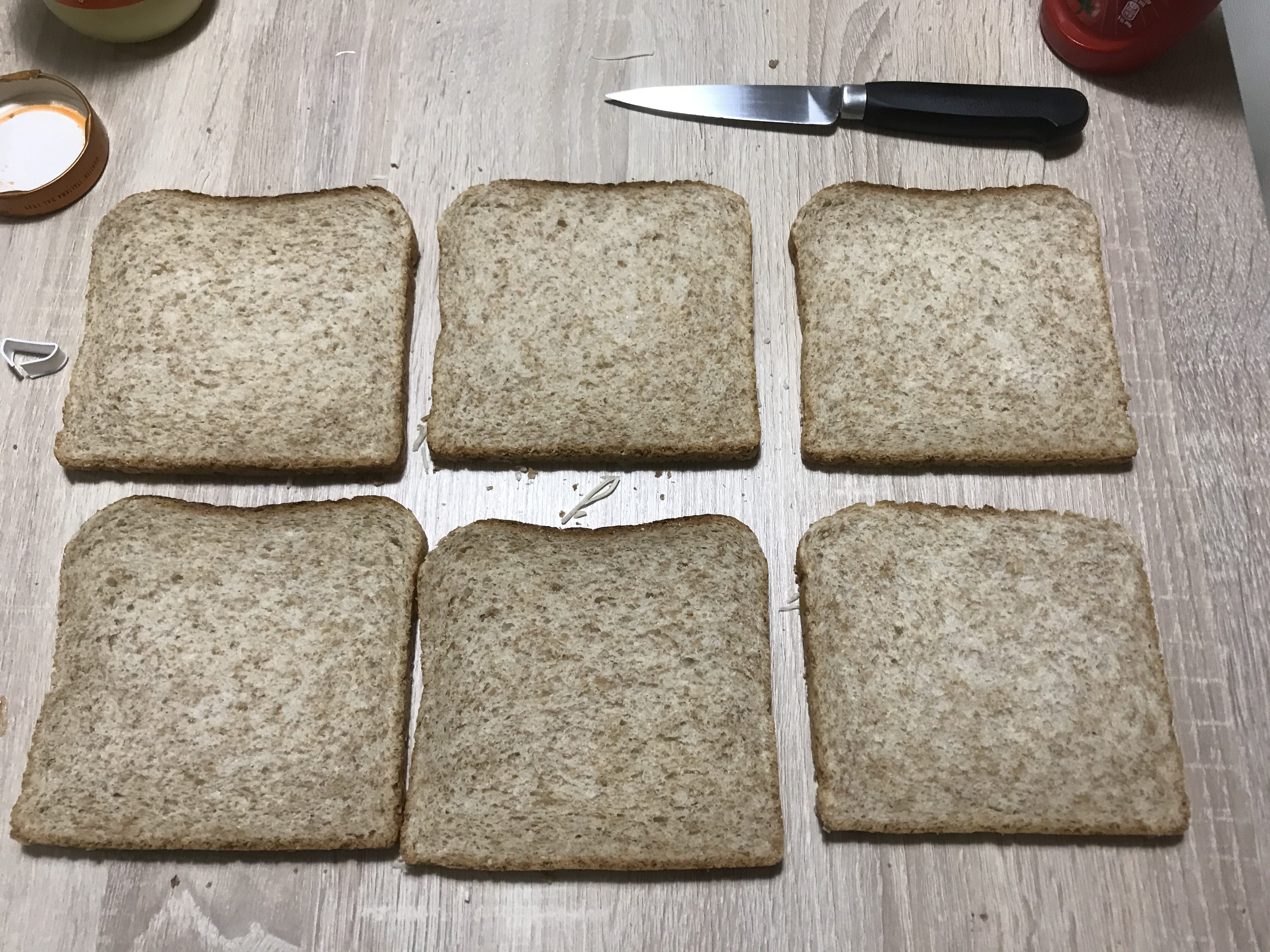 1. Étale tes tranches de pain de mie bien à plat devant toi, sur 2 rangées l'une au-dessus de l'autre.