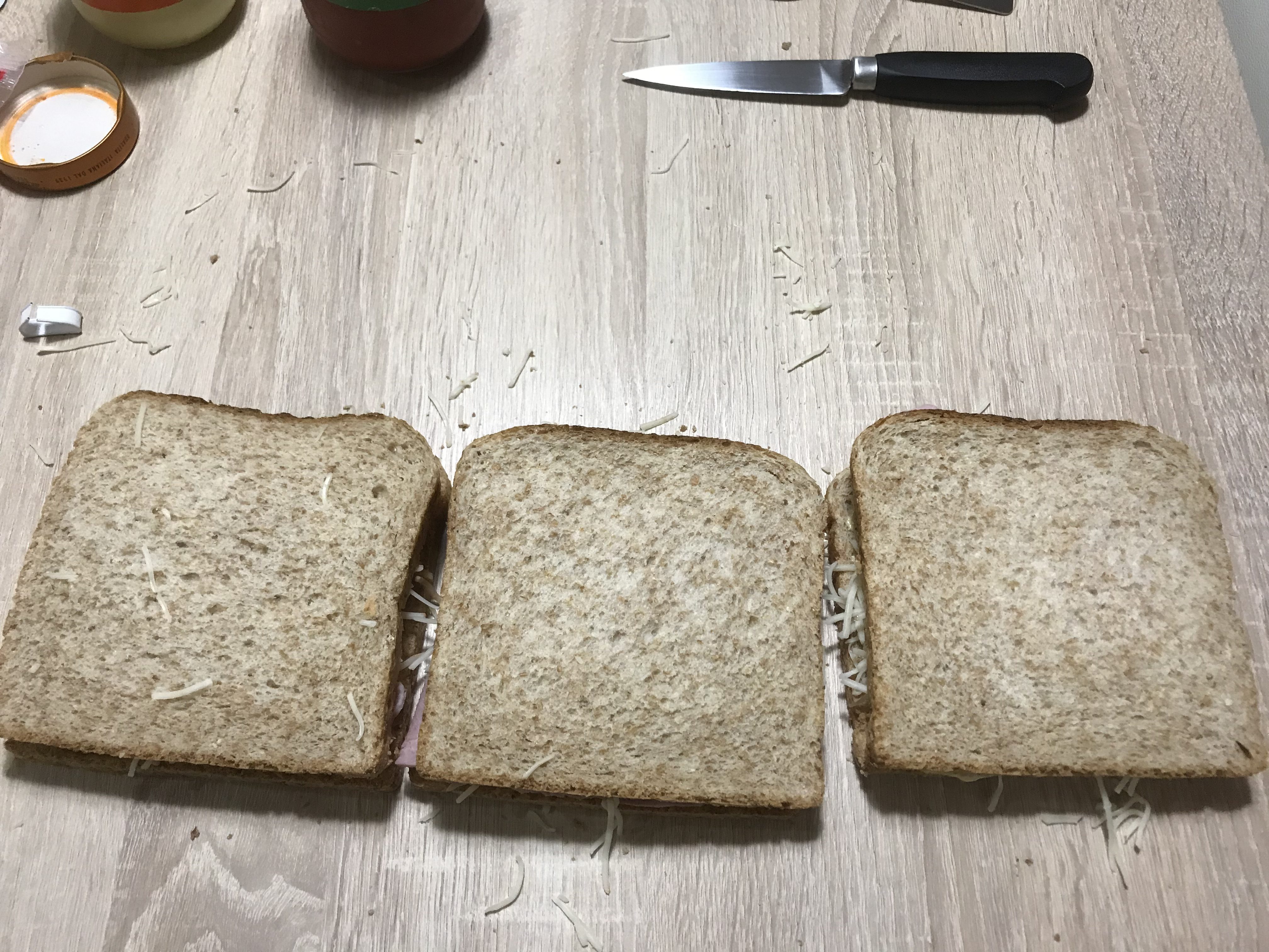 9. Pour finir, rabats la tranche du haut sur celle du bas qui a le jambon, pour former un sandwich.