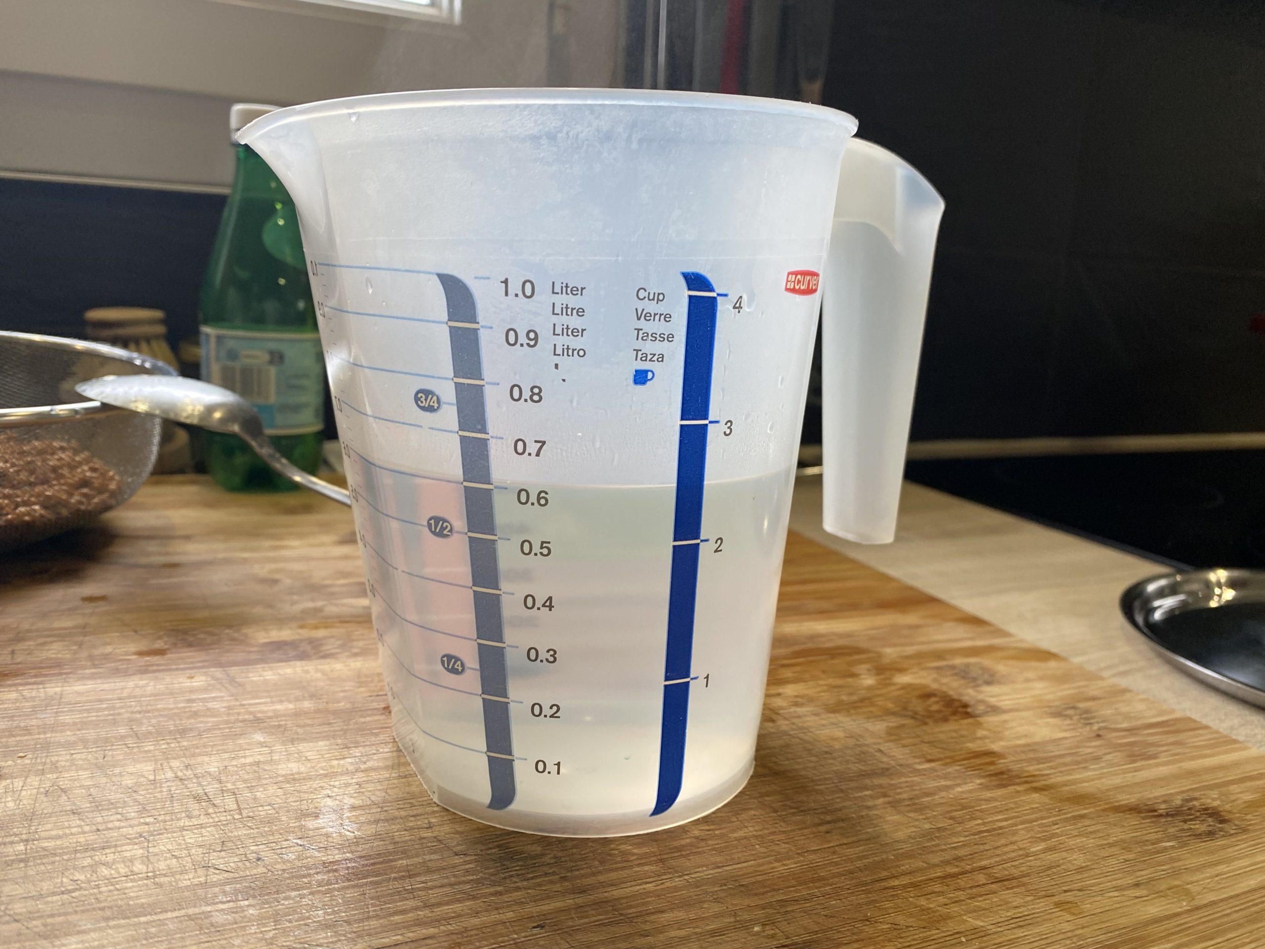 - Verse les grains dans un récipient (verre mesureur idéalement) et note le VOLUME occupé.