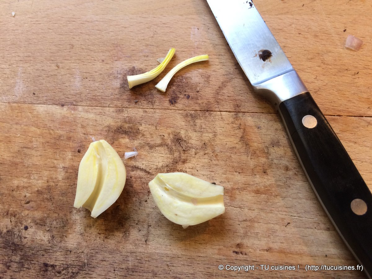 2. Épluche la gousse d'ail et presse-la dans la poêle.