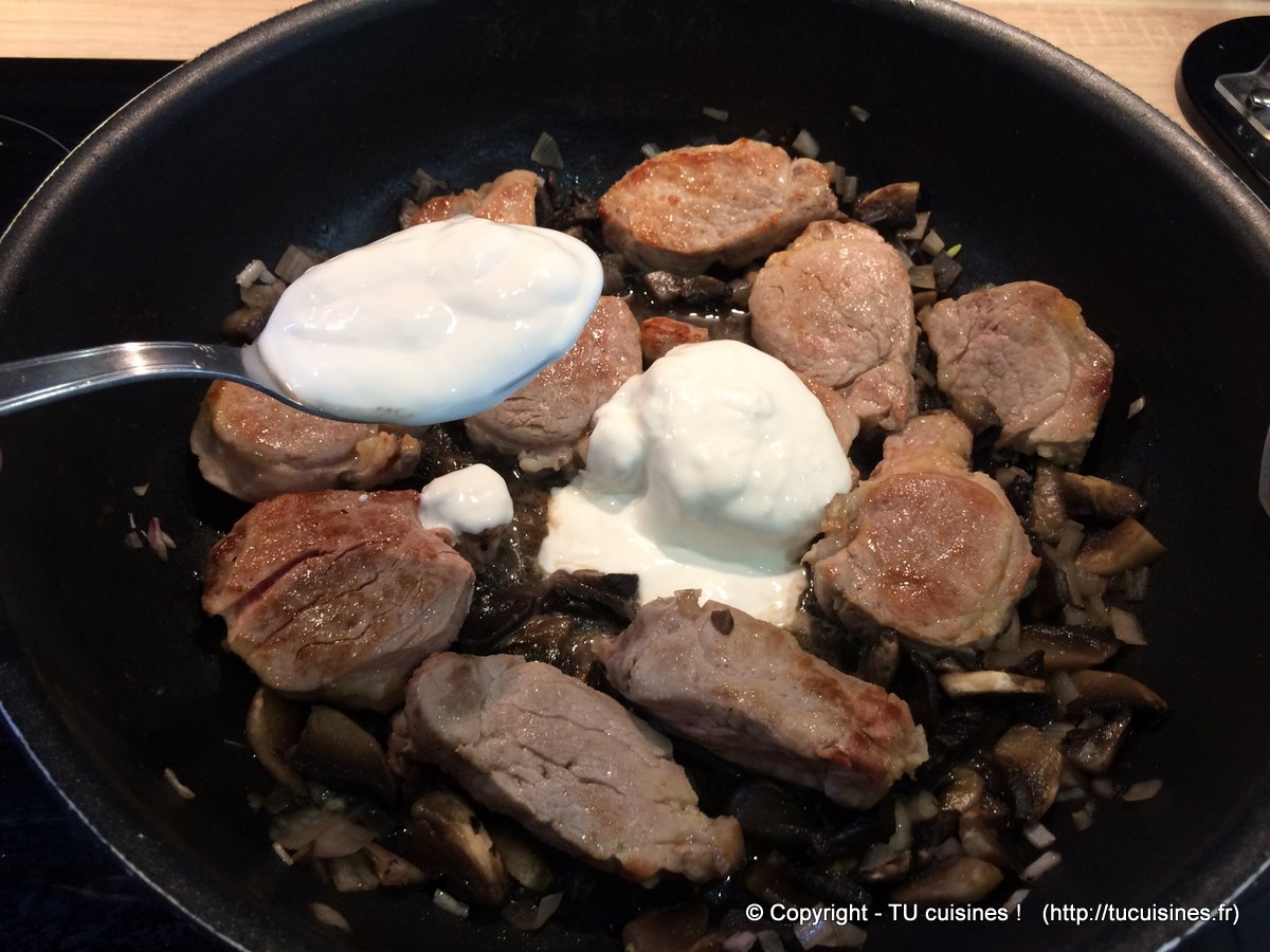 1. Ajoute 2 à 3 cuillères à soupe de crème fraîche dans la poêle.