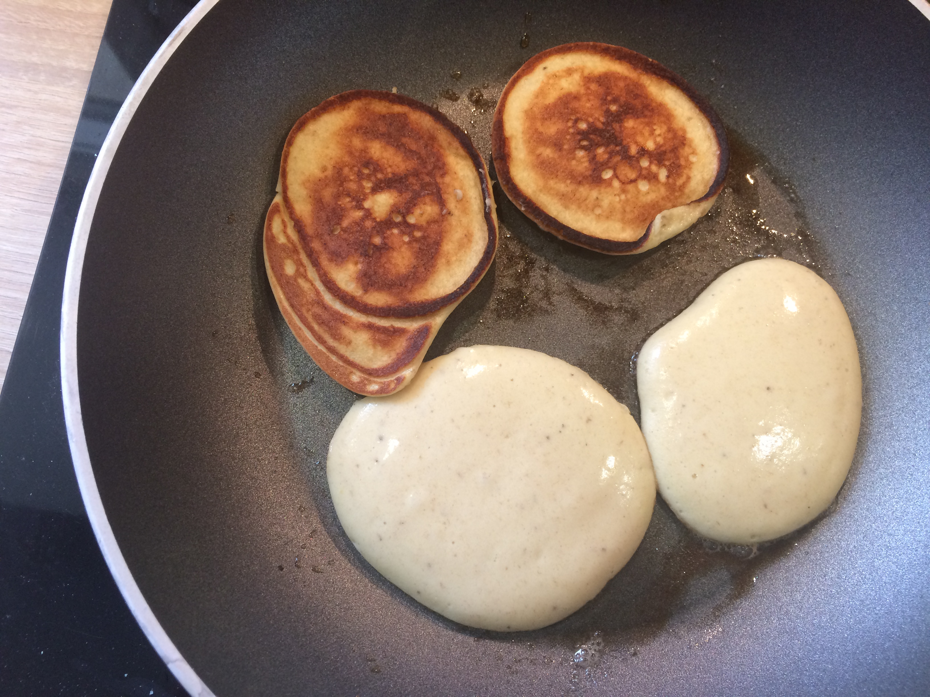 - Verse de petits tas de pâte dans la poêle, selon la taille de pancakes souhaitée.