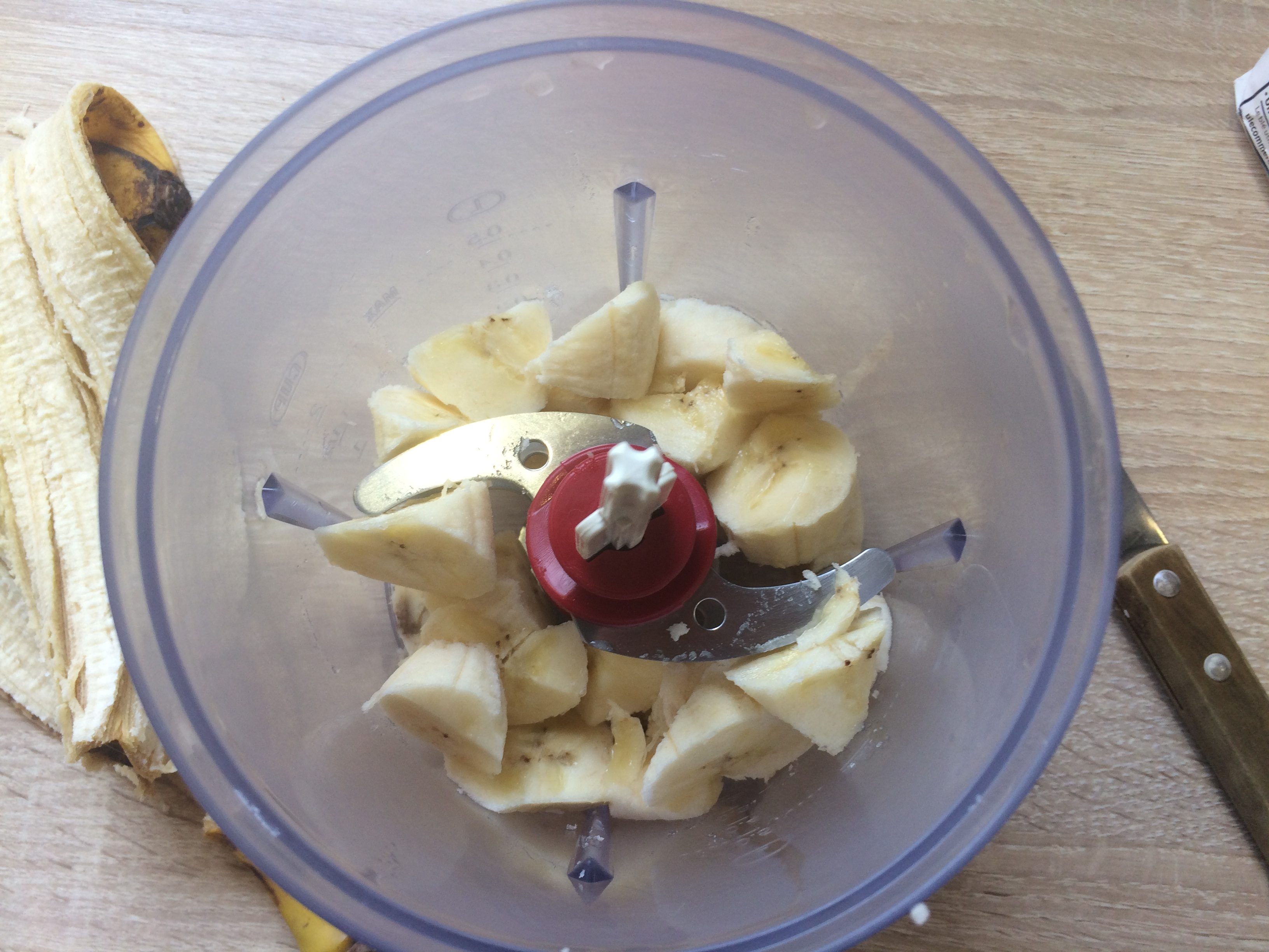 - Épluche et coupe la banane en morceaux et mets-les dans le bol du mixeur.
