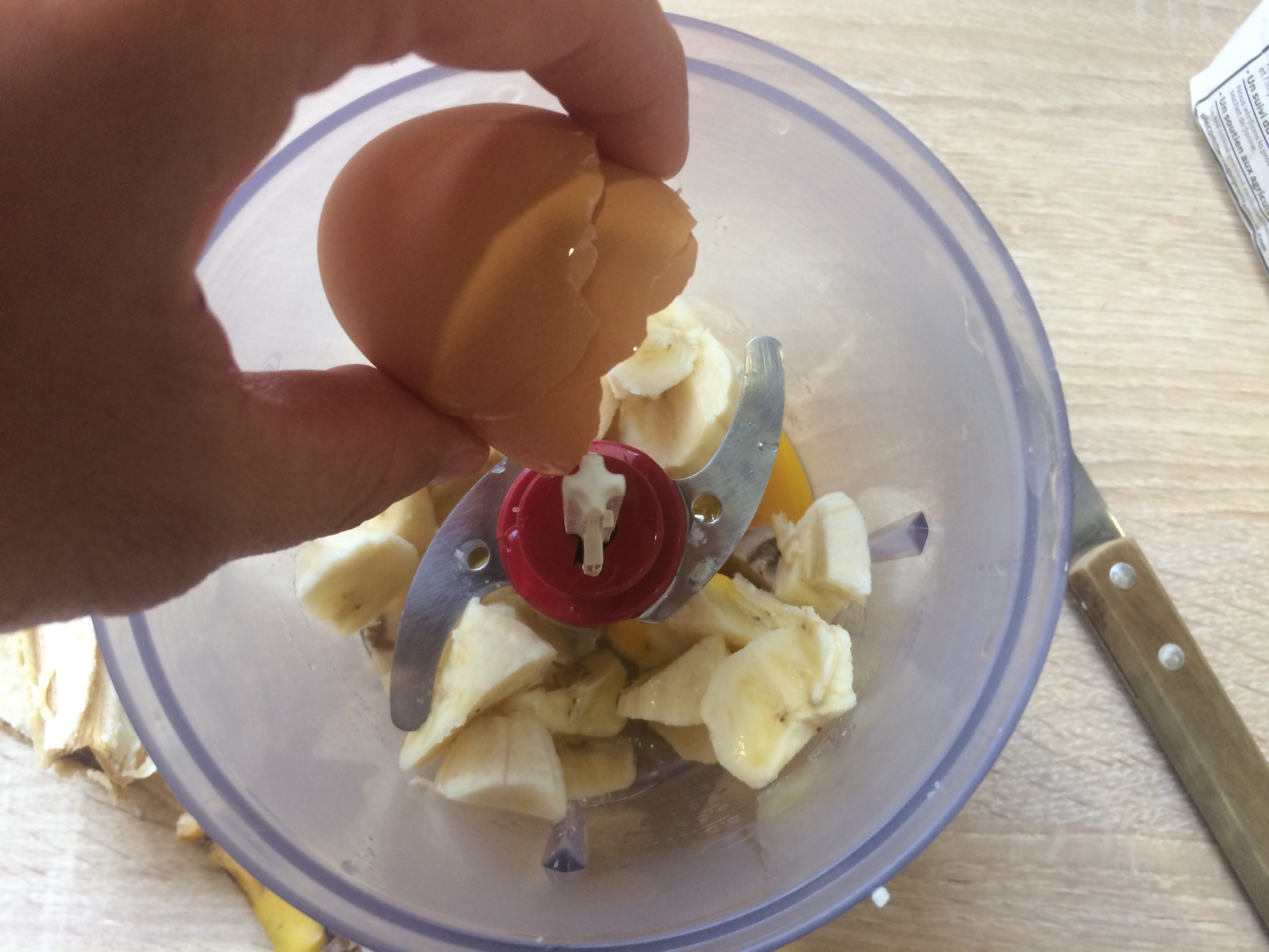 - Casse l’œuf et verse-le en entier (blanc + jaune) avec la banane.