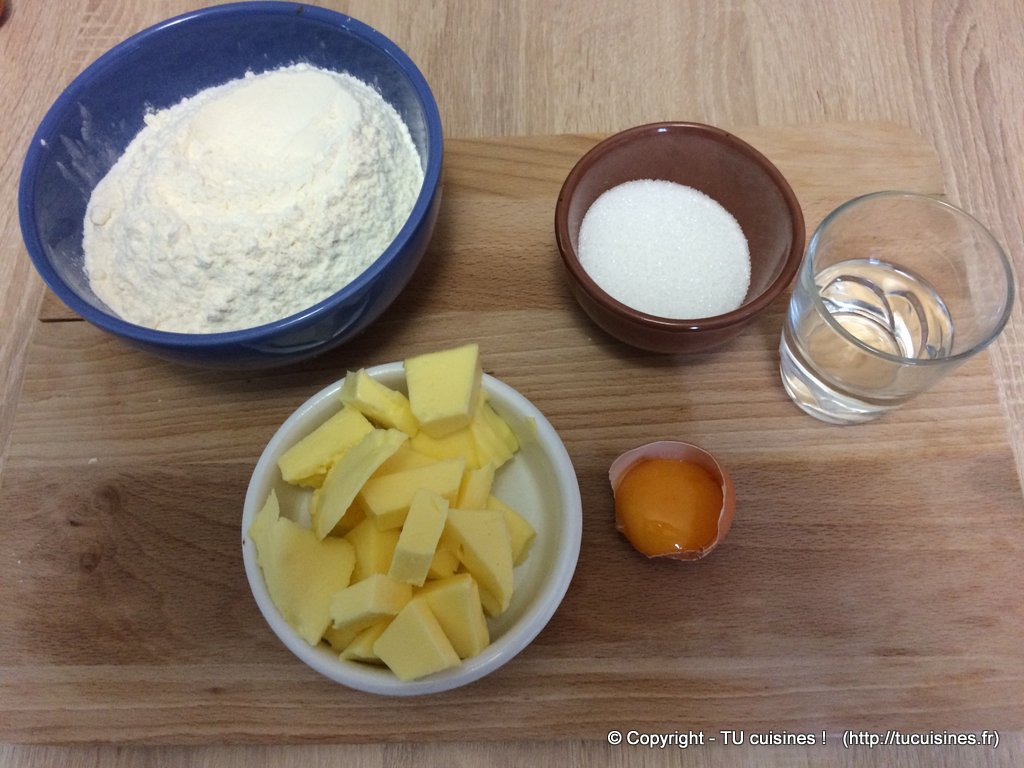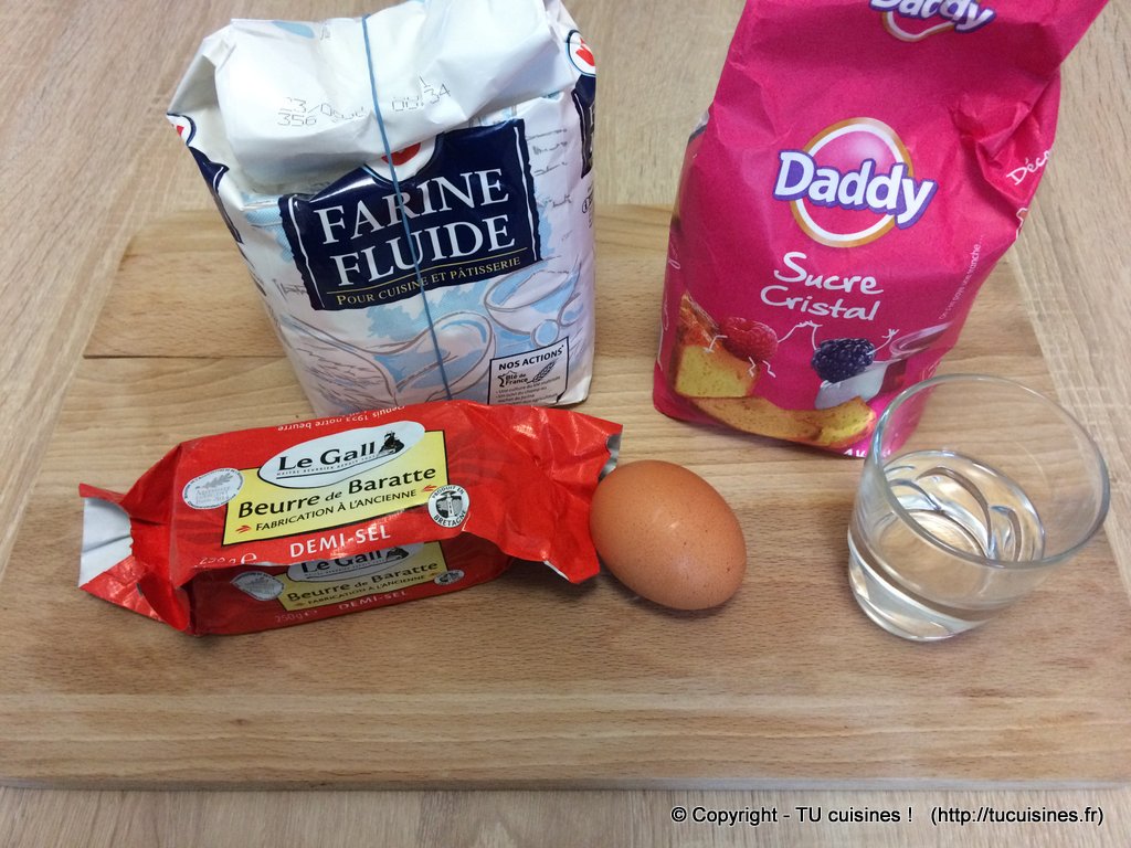 - Pèse tous les ingrédients : farine (250g), beurre (125g), sucre (50g), eau (5cl)