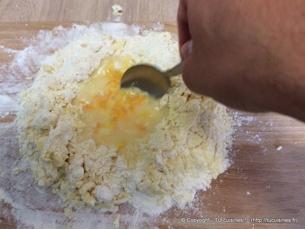 - Mélange bien "la farine au beurre avec l’œuf à l'eau" avec tes doigts, en ramenant progressivement la préparation de farine au centre de la fontaine, dans l’œuf dilué avec l'eau.