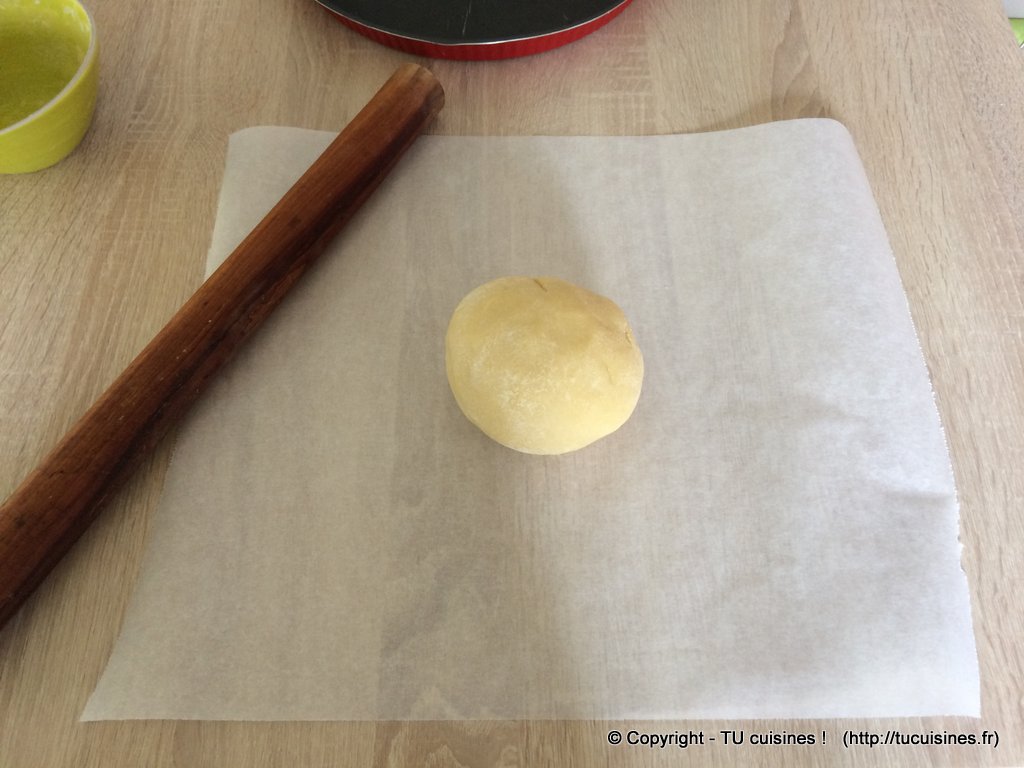 - Avec un rouleau à pâtisserie, tape la boule pour former un galet de pâte.