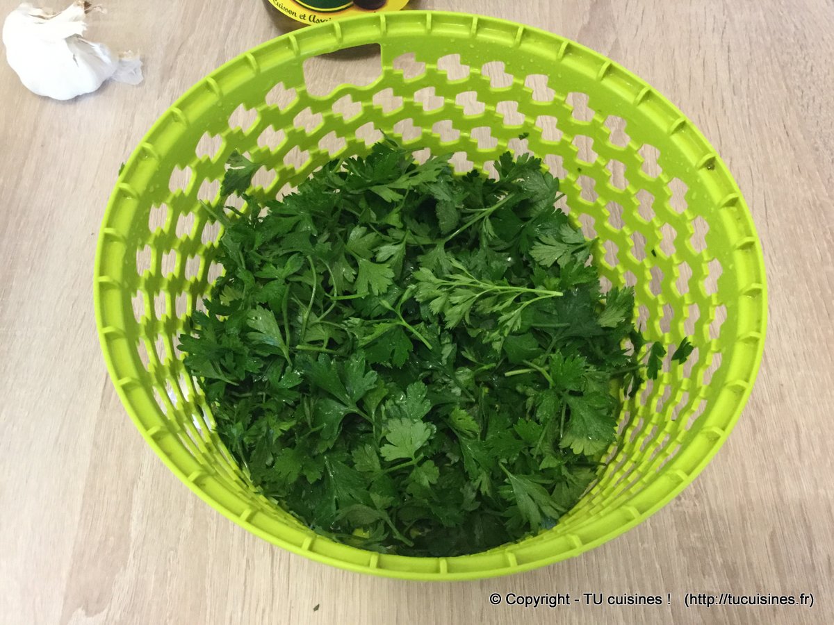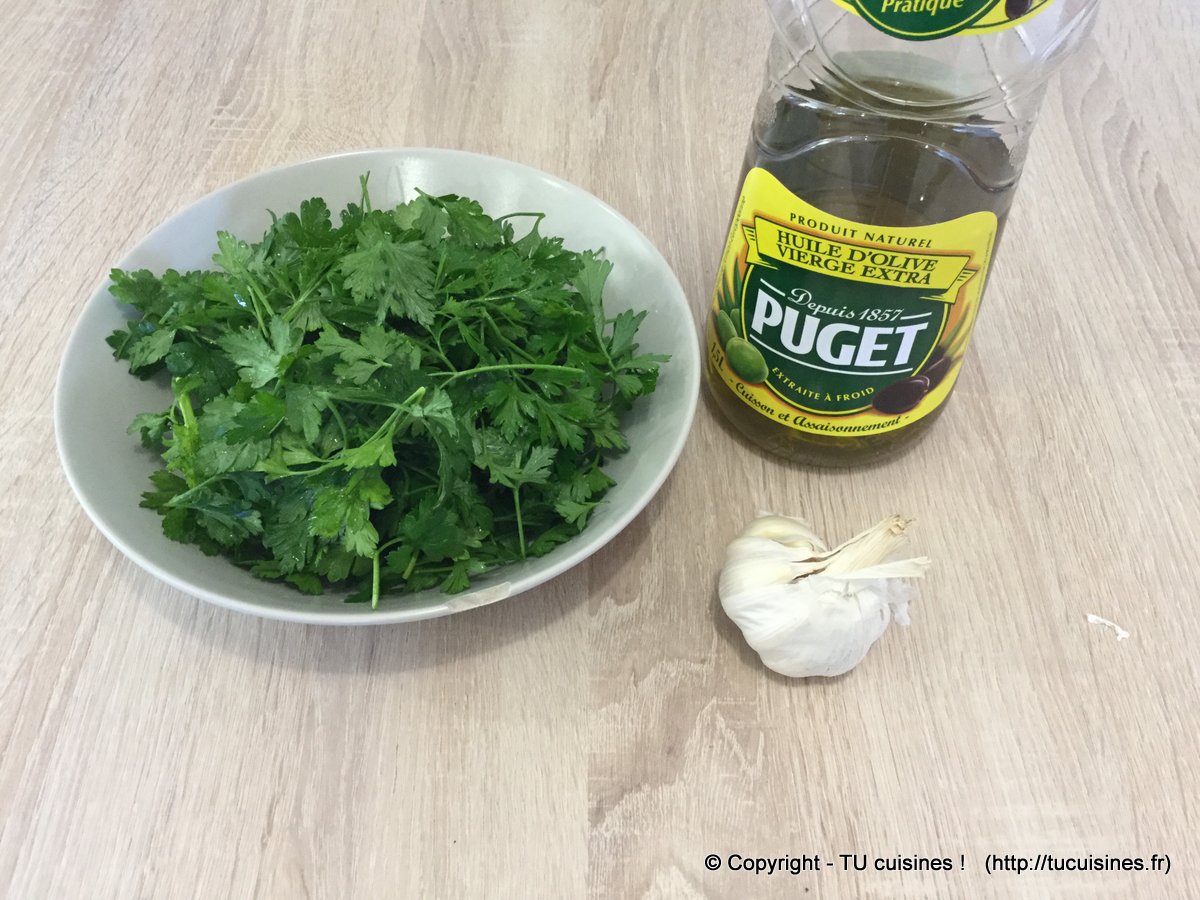 - Prépare tes ingrédients : persil (1 botte), ail (8 gousses environ) et huile d’olives (15 cl)