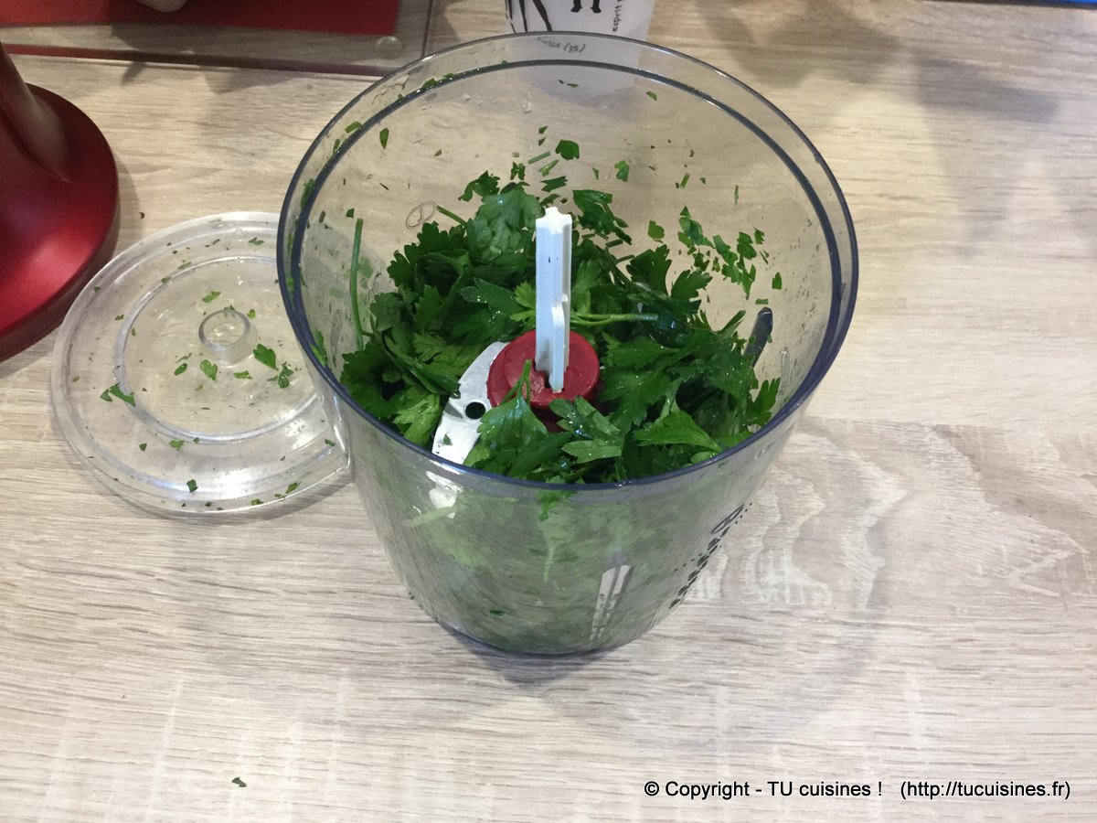 ... ou bien sinon il va falloir le faire très finement à la main. - J'utilise une "multi-moulinette" 3 lames de Moulinex, ce petit mixeur marche super bien pour ce genre de tâches, je ne pourrais plus m'en passer... ... Voilà, c'était mon "conseil télé-achat" du jour ! 🙂