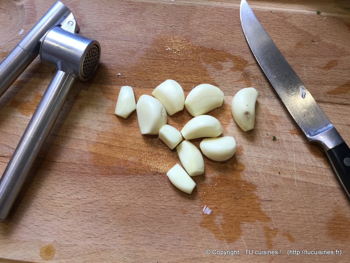 - Epluche les gousses d'ail, coupe-les en deux, et enlève éventuellement leur "tige centrale".