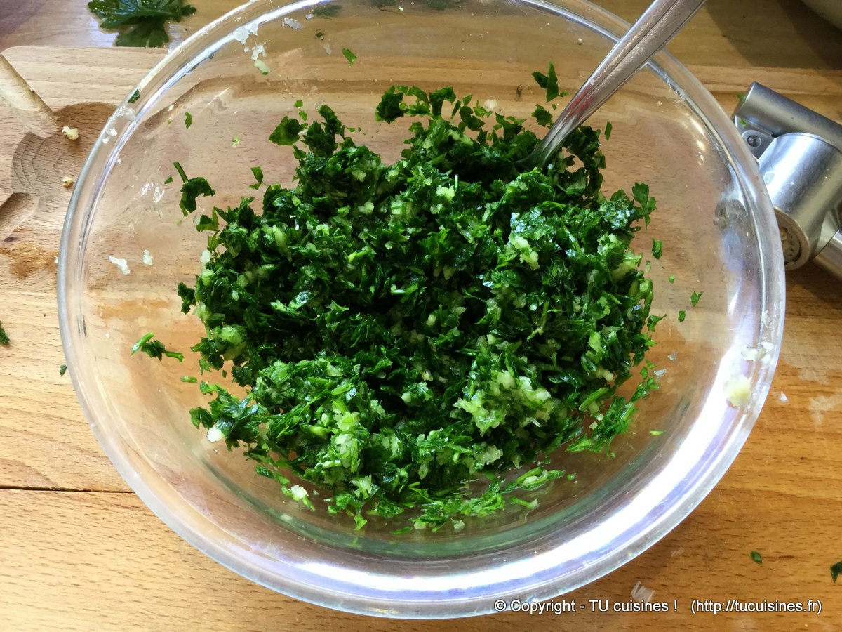 - Il ne te reste plus qu'à bien mélanger tout ça pour bien répartir l'ail dans le persil.