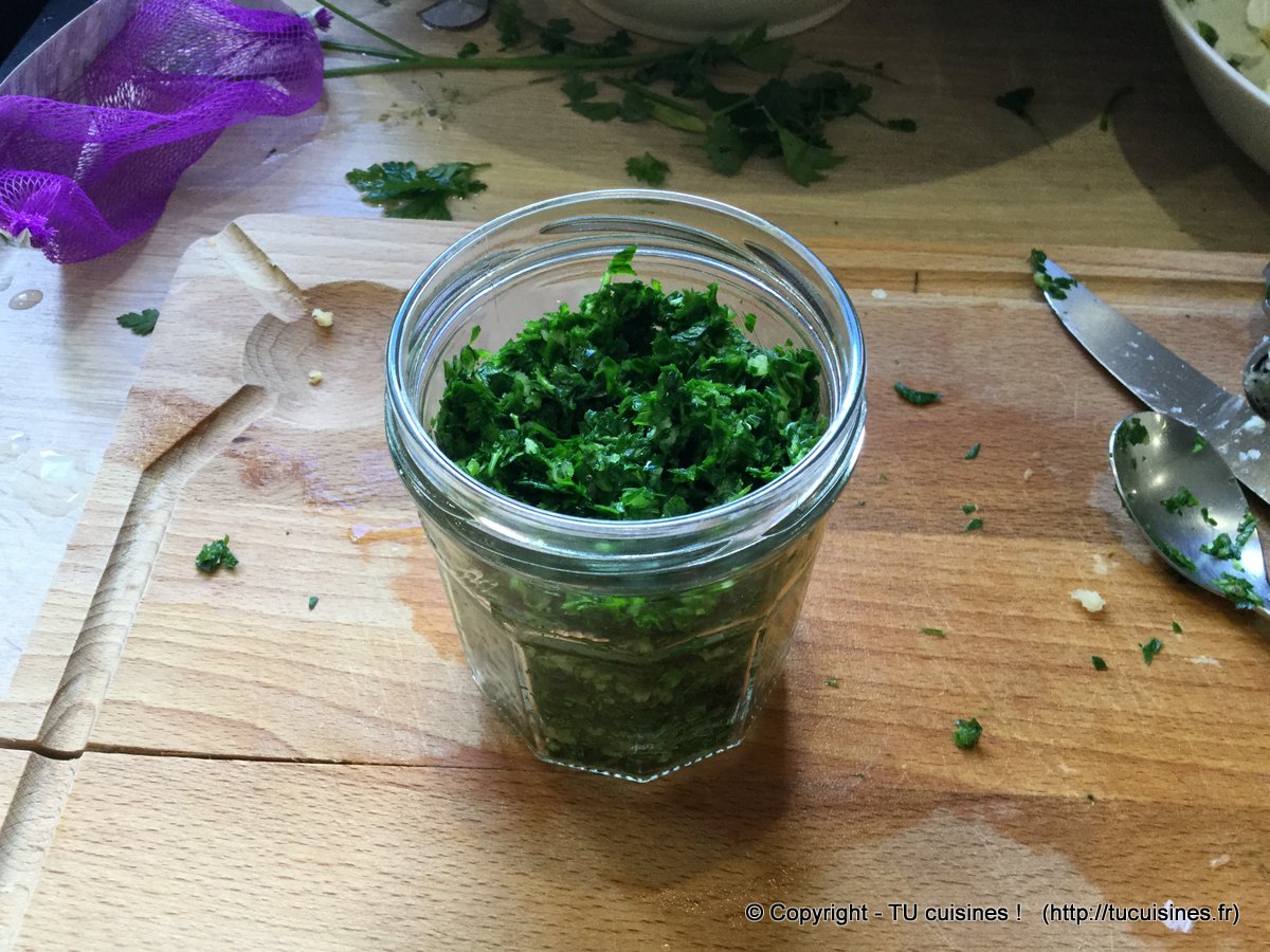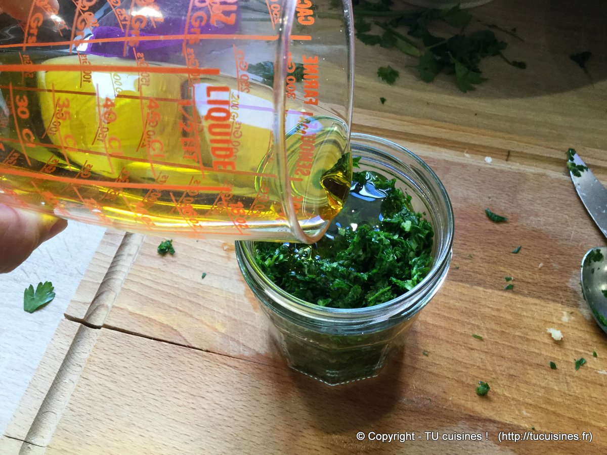 - Pense à le faire en plusieurs fois, pour laisser le temps à la persillade de "boire " l'huile d'olives que tu verses et qu'elle descende bien jusqu'au fond du pot.