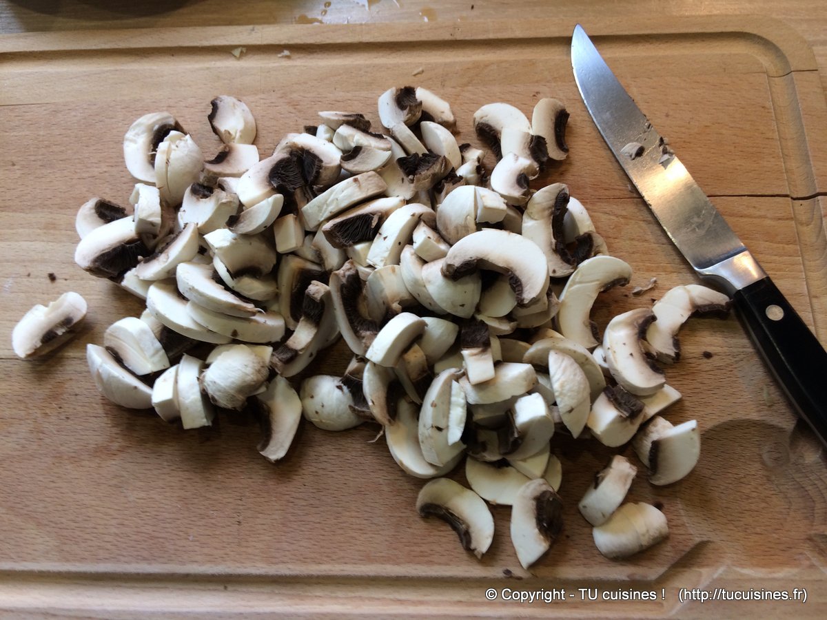 - Pendant ce temps, épluche et coupe en lamelles les champignons de Paris frais.