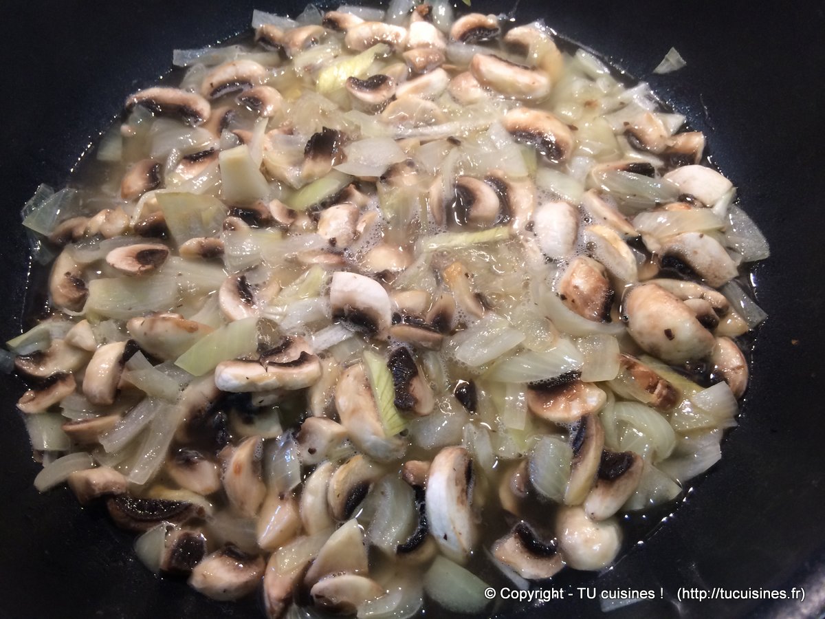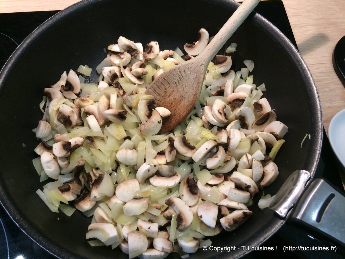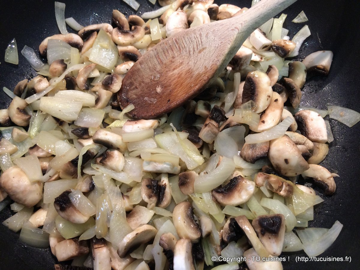 - Pré-cuis les oignons et les champignons (10 min à feu moyen)