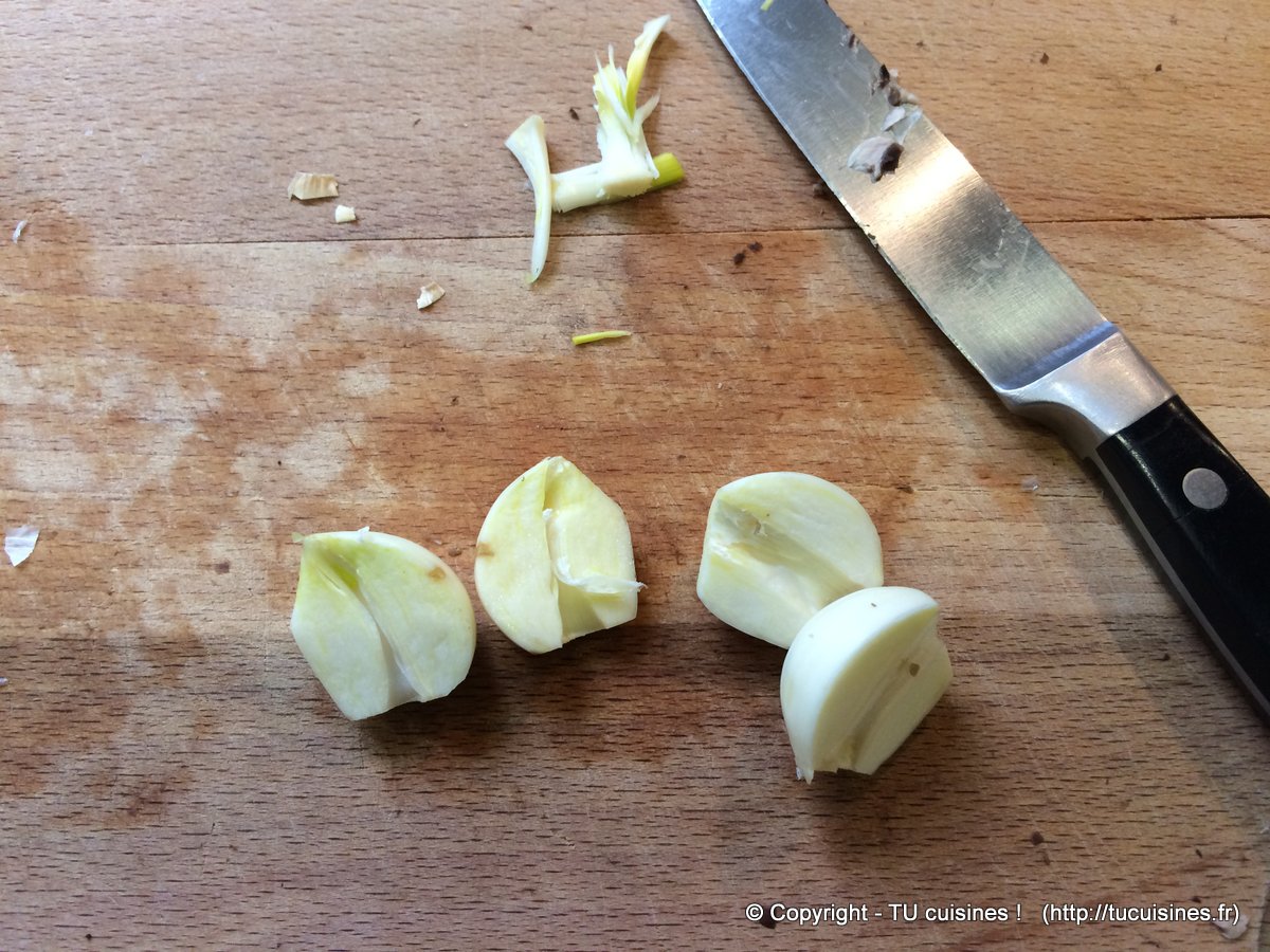 - Pendant ce temps épluche et coupe l’ail en enlevant la tige verte au milieu