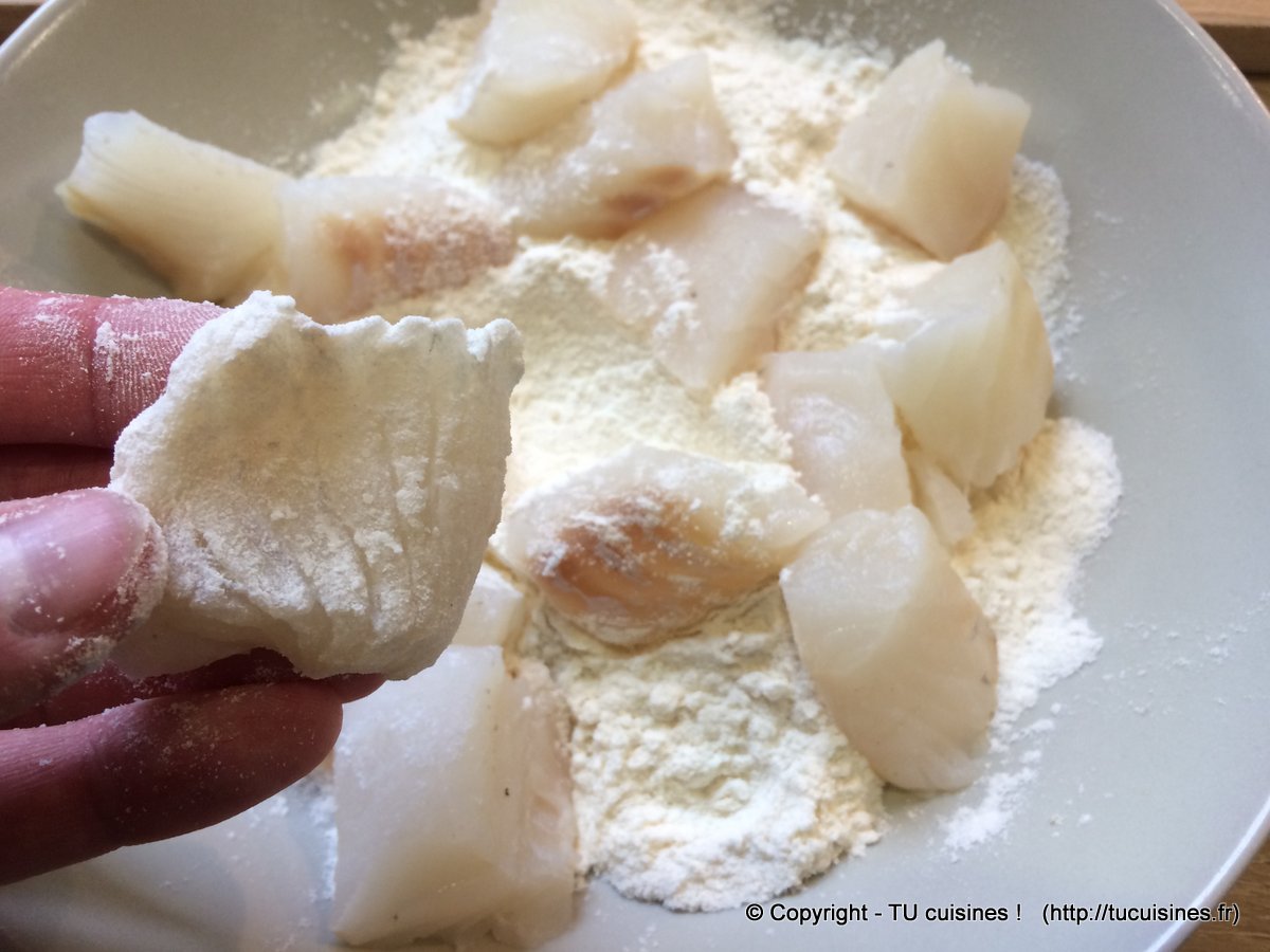 - Prends soin de frotter un peu les cubes de poisson enfarinés avant des les ajouter dans la poêle, afin d'enlever l’excédent de farine : ils doivent en effet juste être recouverts d'une fine couche de farine collée sur la chair du poisson.