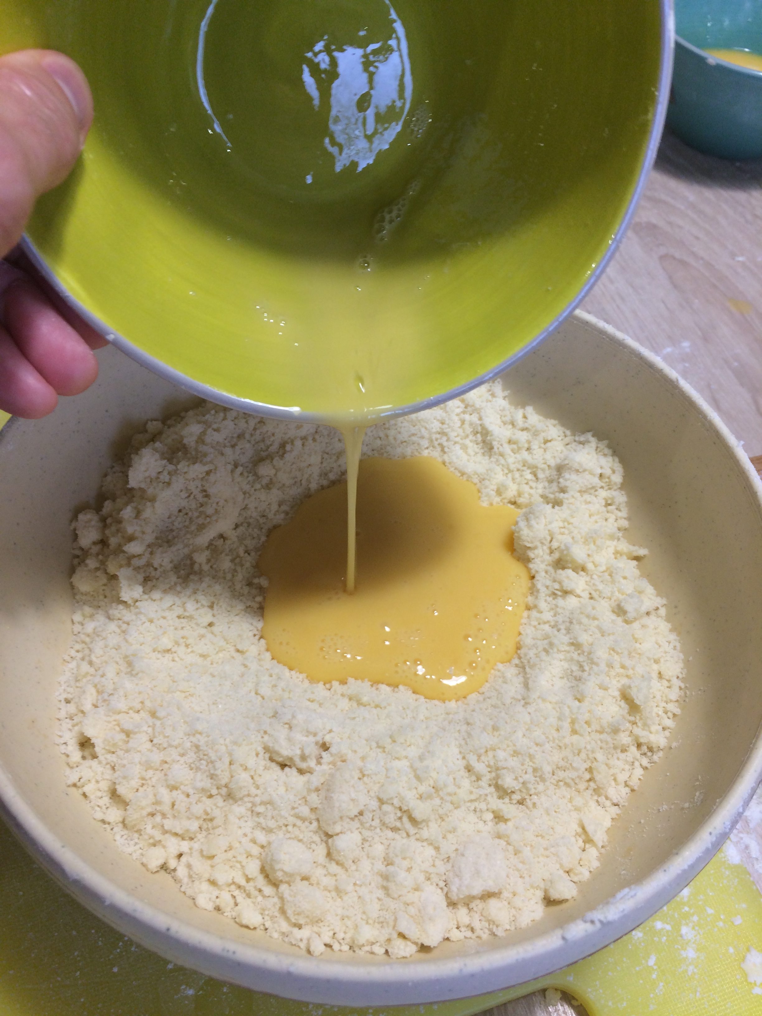 - Verse le tout dans le saladier, dans le "trou" fait précédemment dans la poudre de beurre/farine.