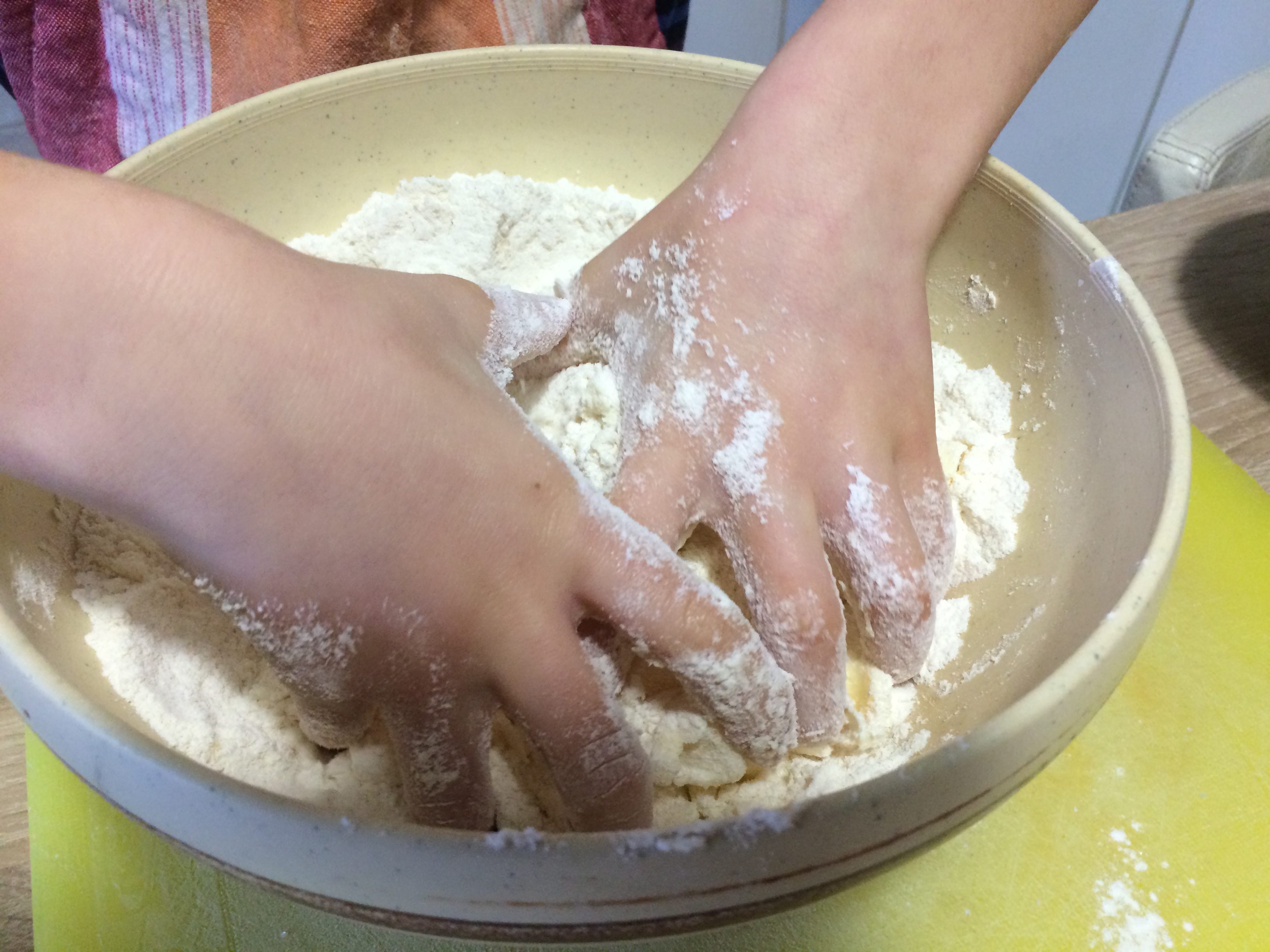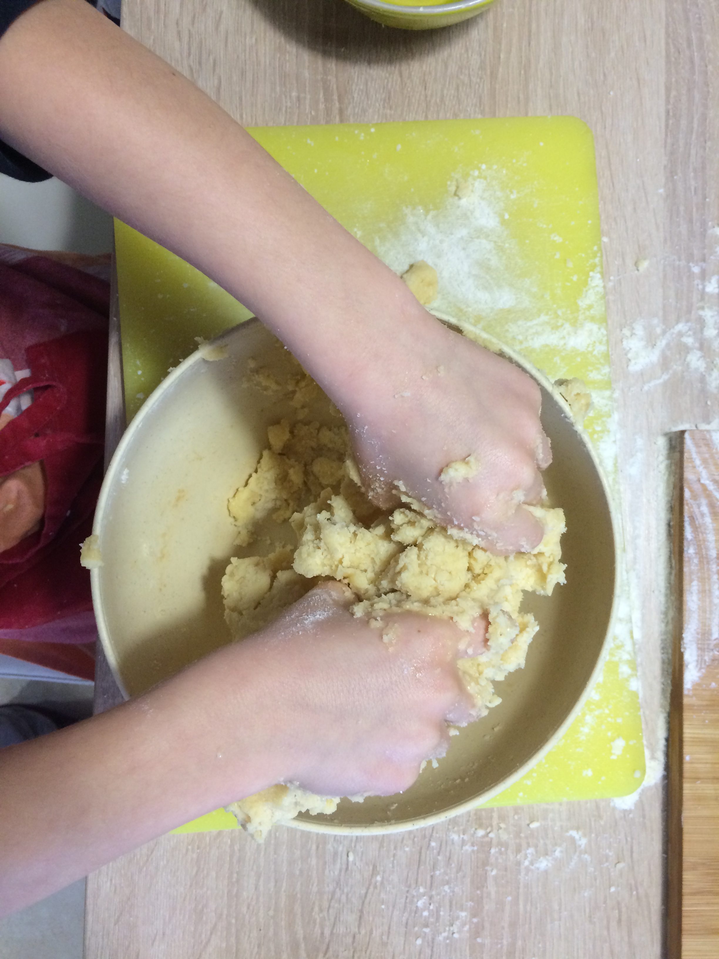 - Attention ça colle aux doigts ! N'hésite pas à mélanger franchement, au bout d'un moment tu auras une boule de pâte encore un peu collante mais homogène.