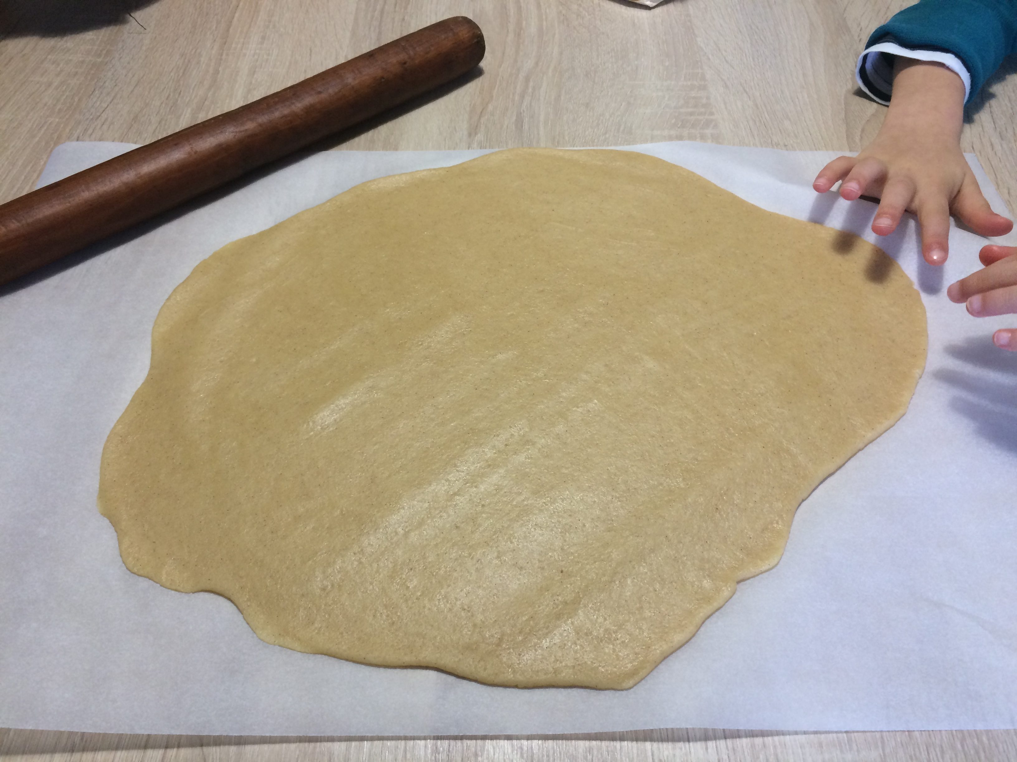 - Puis étale la pâte avec ton rouleau à pâtisserie, assez finement, jusqu'à une épaisseur d'environ 2 à 3 mm.