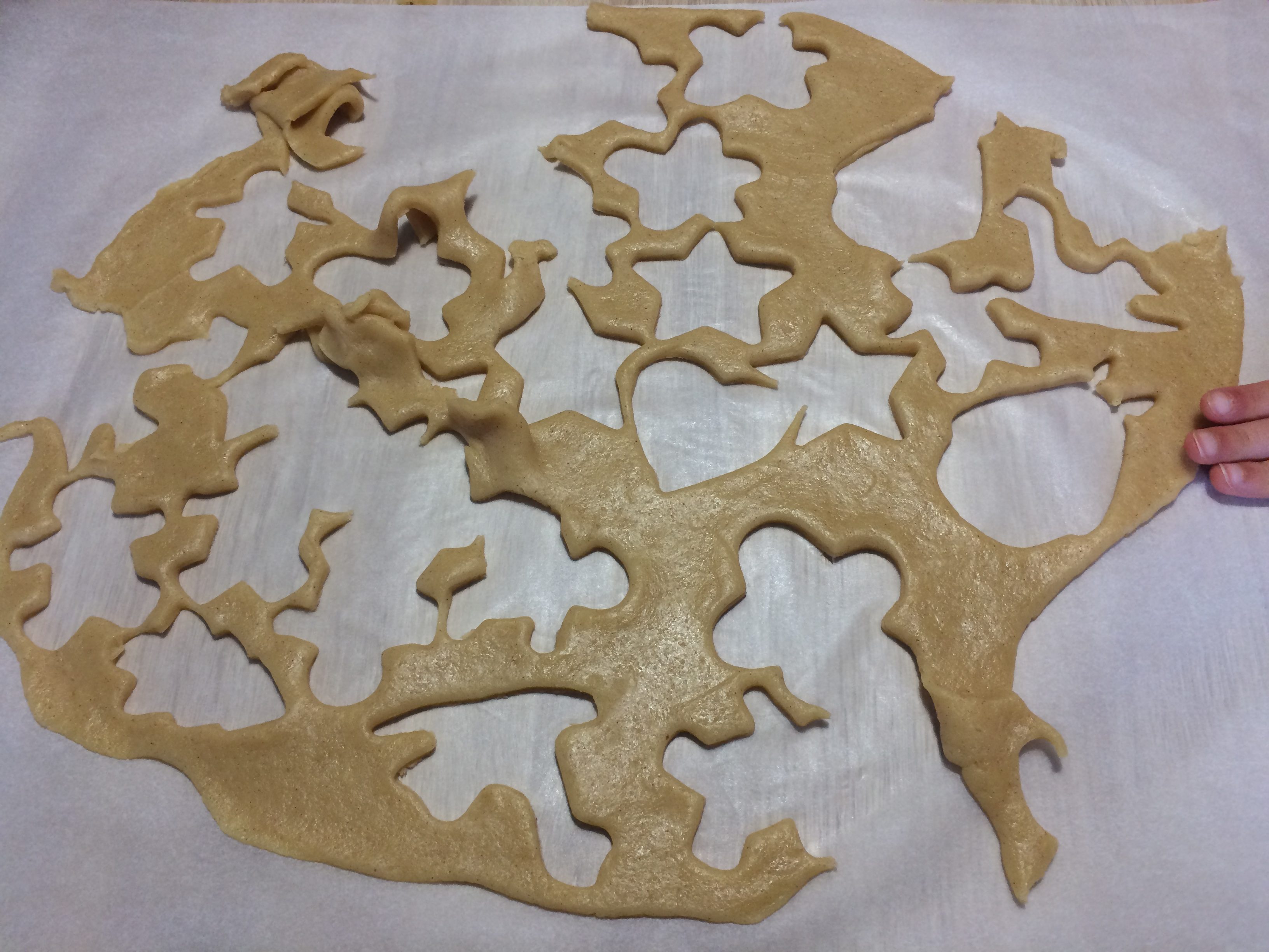- Avec les chutes de pâte, reforme une boule (plus petite évidemment), et recommence (étale, découpe des formes), jusqu'à ce qu'il n'y ait plus assez de pâte.