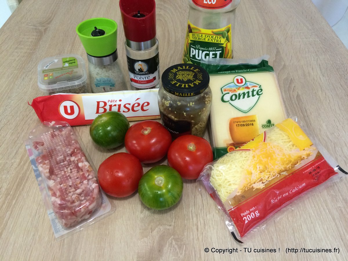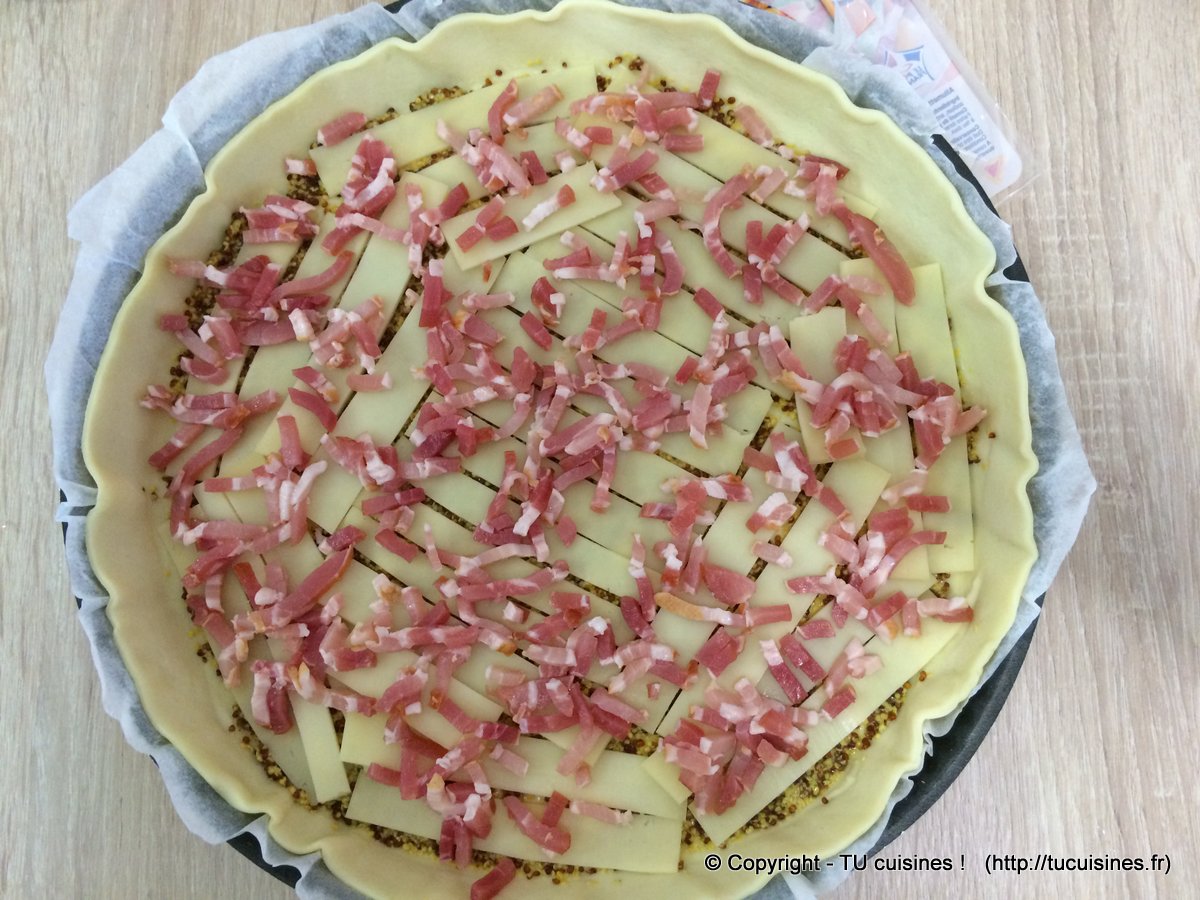 Recette de tarte fine à la tomate, lardons et moutarde