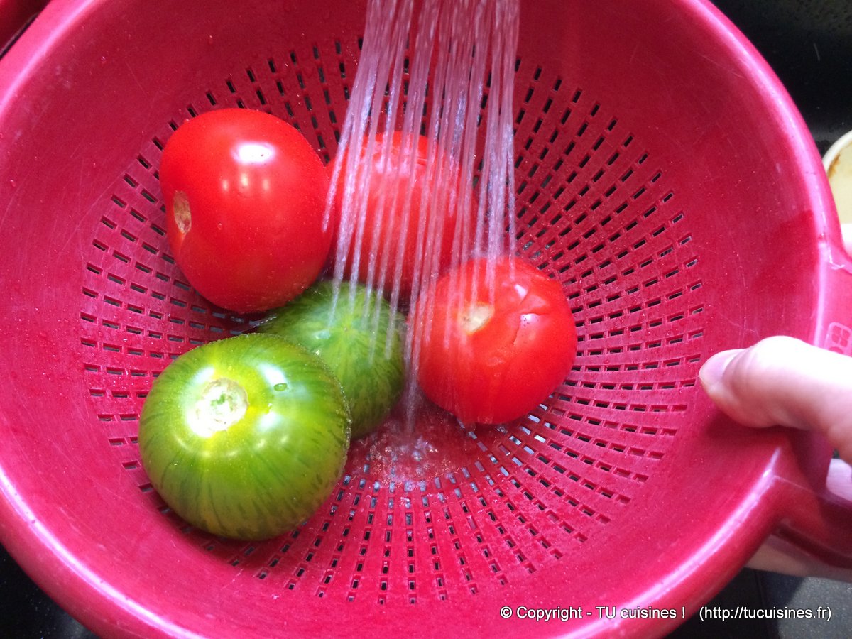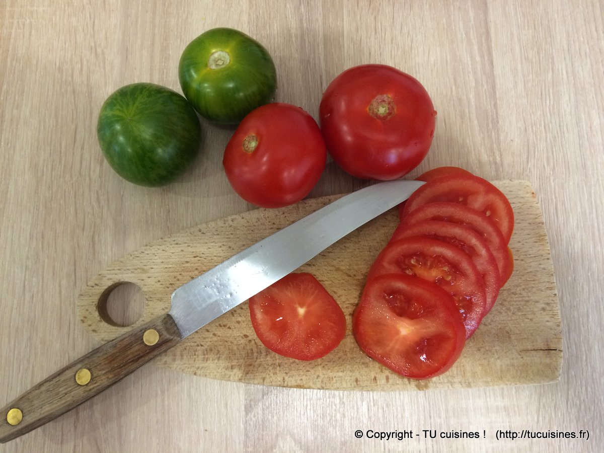 2. Pour un meilleur aspect visuel, pense à couper les rondelles de tomate "dans le bon sens" (celui de son "équateur") pour qu'elles soient bien belles (c'est-à-dire que le trognon ne doit pas être coupé en deux...)
