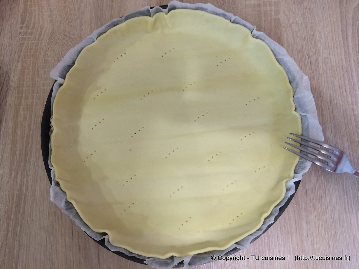 1. Dans un moule à tarte, étale la pâte et piques le fond de tarte avec quelques coups de fourchette.