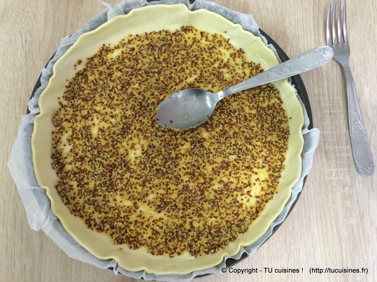 1. Répartis environ 4 grosses cuillères à soupe de moutarde en une fine couche pour recouvrir tout le fond de la pâte à tarte.