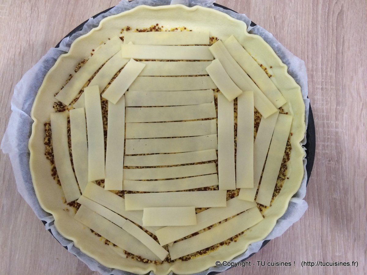 1. Saupoudre de gruyère râpé (environ 100 à 150 grammes) de façon homogène, ou encore mieux si tu peux : coupe de (très) fines lamelles d'emmental ou de Comté (environ 1 mm d'épaisseur) que tu disposeras sur tout le fond de tarte.