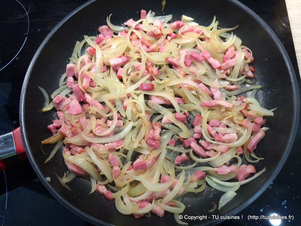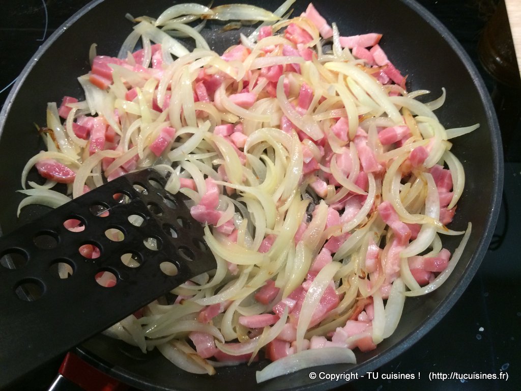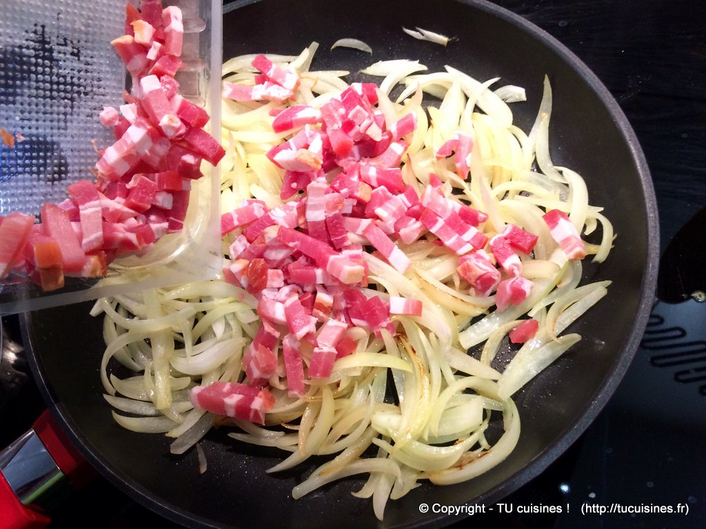 2. Fais revenir les oignons émincés quelques minutes avec les lardons