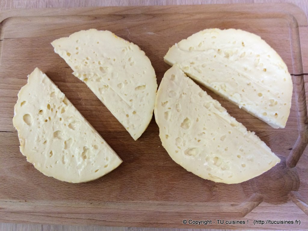 2. Puis coupe le reblochon en deux selon son diamètre, afin d'obtenir 2 demi disques.