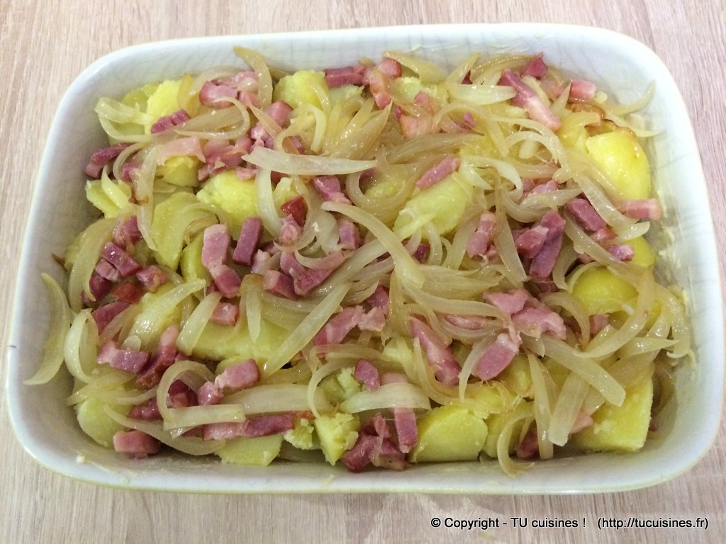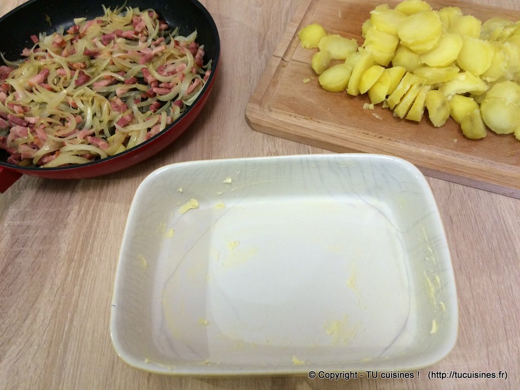 Moi je fais revenir les oignons dans du beurre ensuite je rajoute les lardons avec un peu de crème fraîche. Je réserve et je fais revenir les patates dans un peu de beurre à la poêle et croûte du reblochon en dessous. Super bon