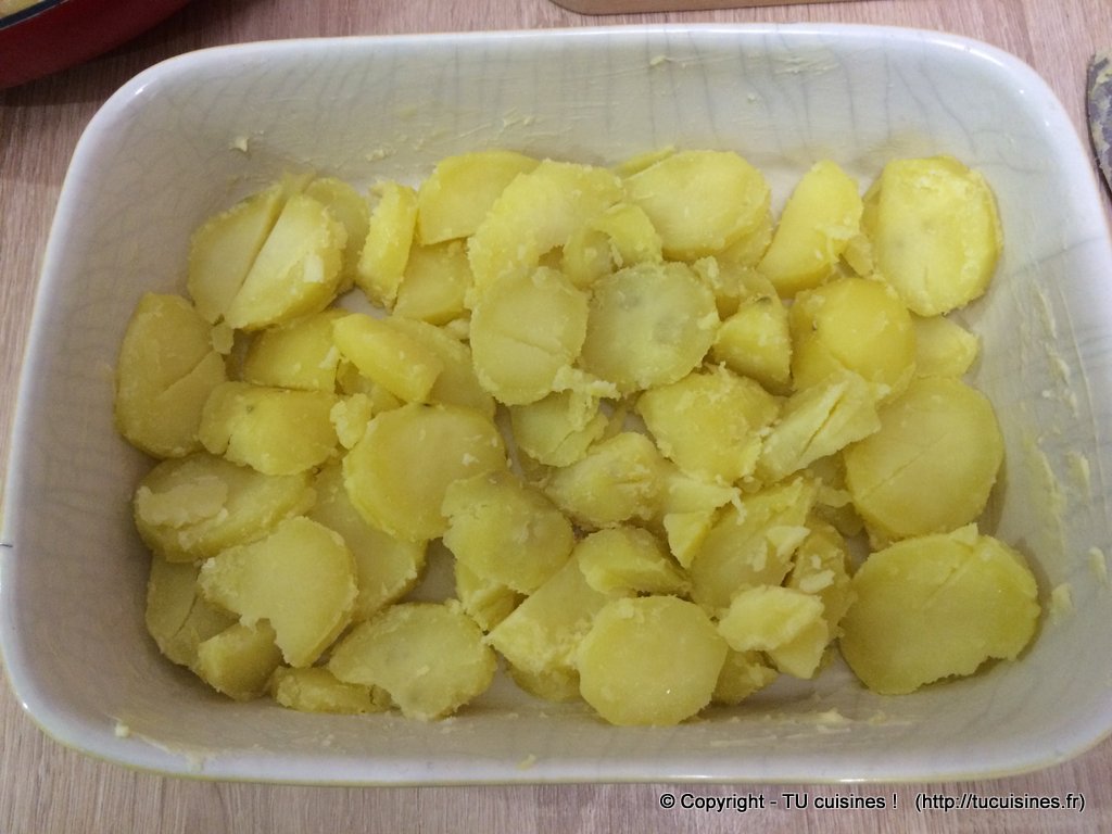 2. Puis dépose au fond du plat une couche avec la moitié des pommes de terre.